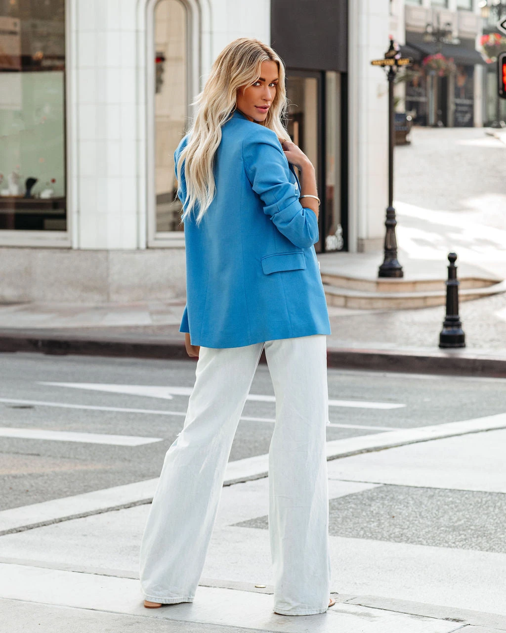 Express your bold side in the Saniya Linen Blend Pocketed Blazer in Ocean Blue that’s detailed with a notched collar.