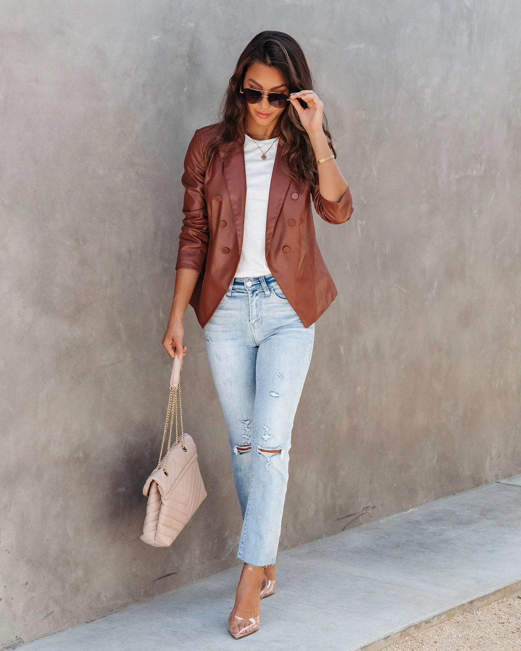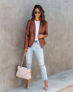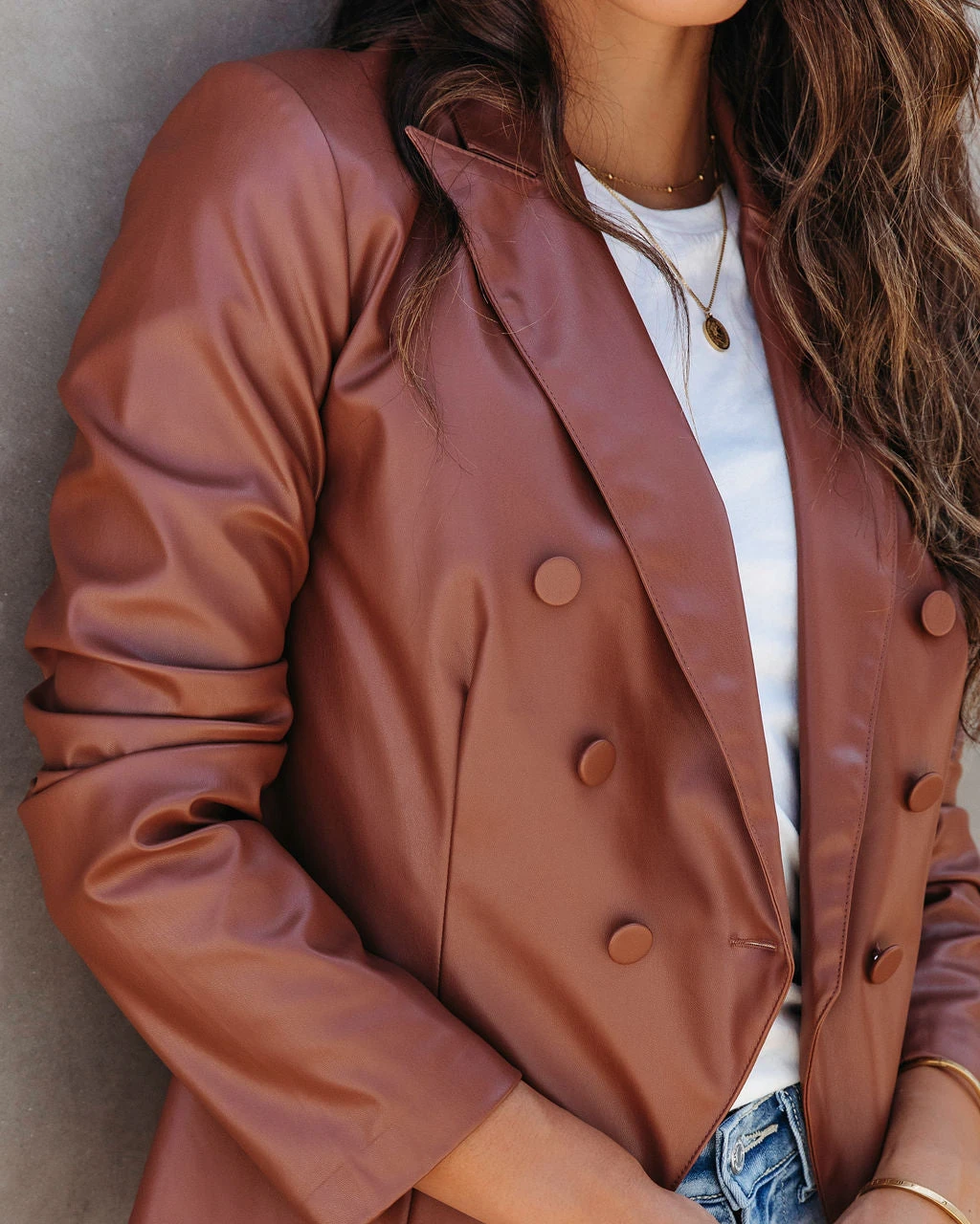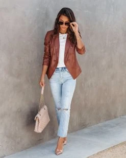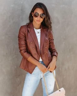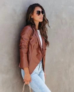 Chic meets sleek in the Angelique Faux Leather Blazer in chestnut that features a notched collar.