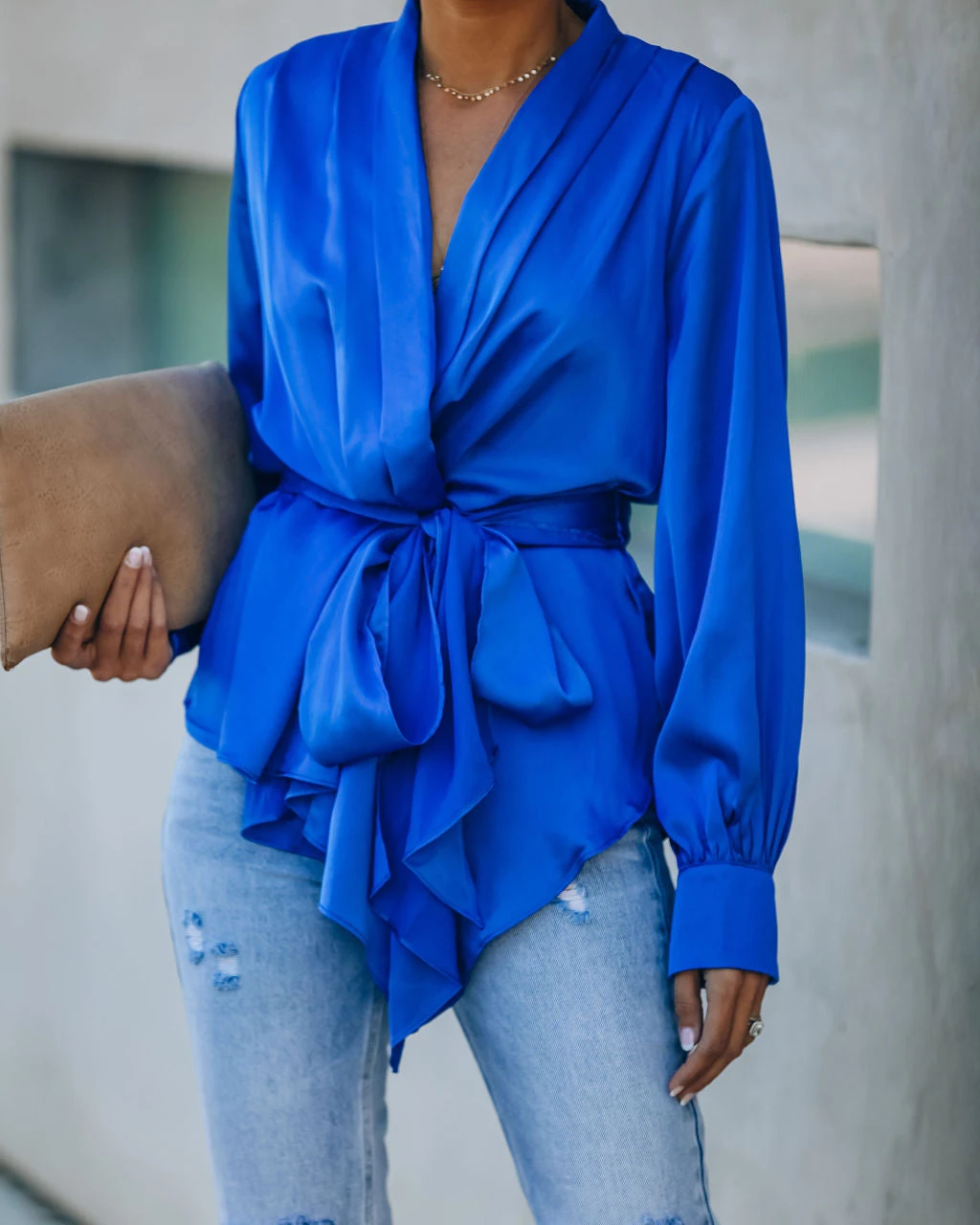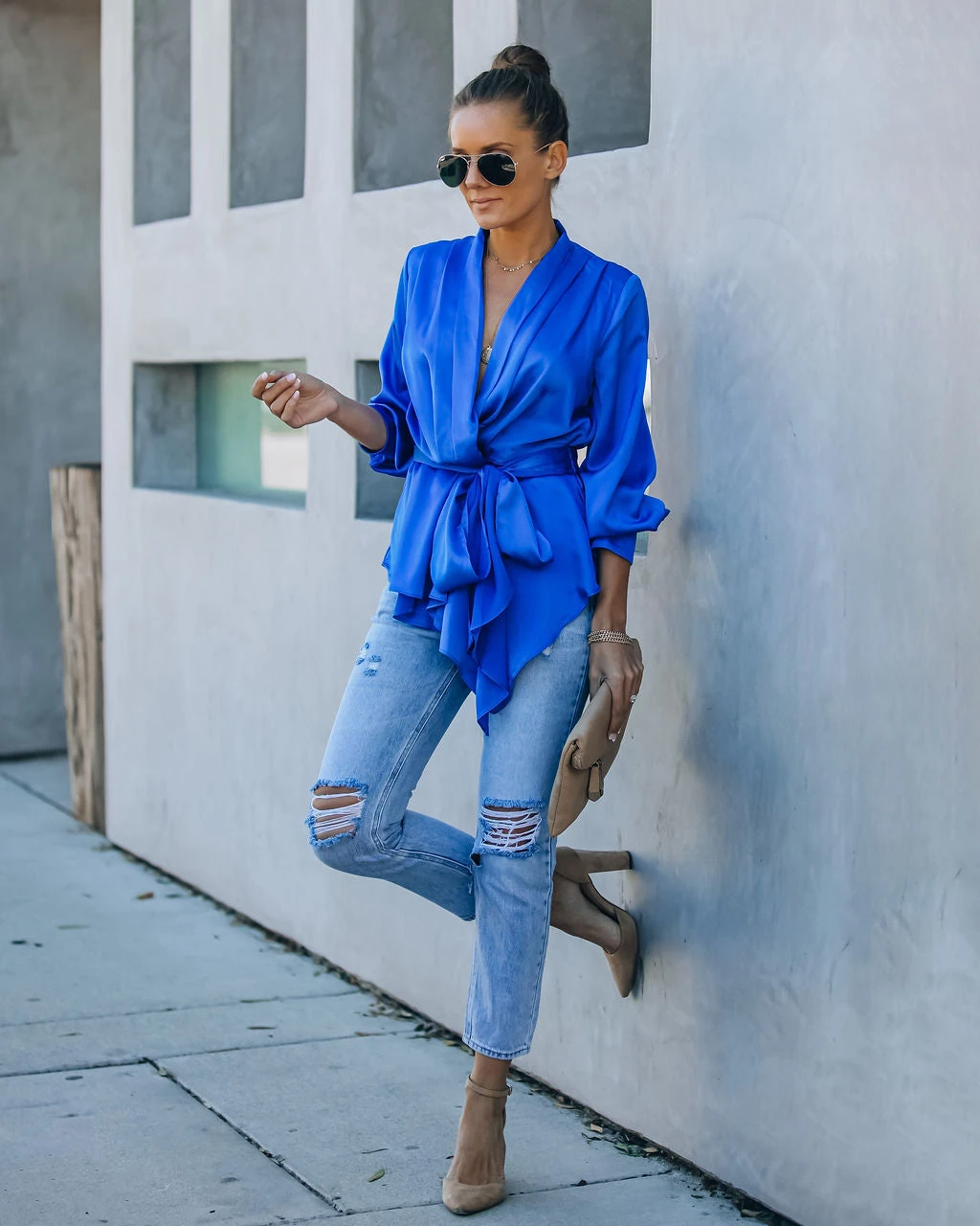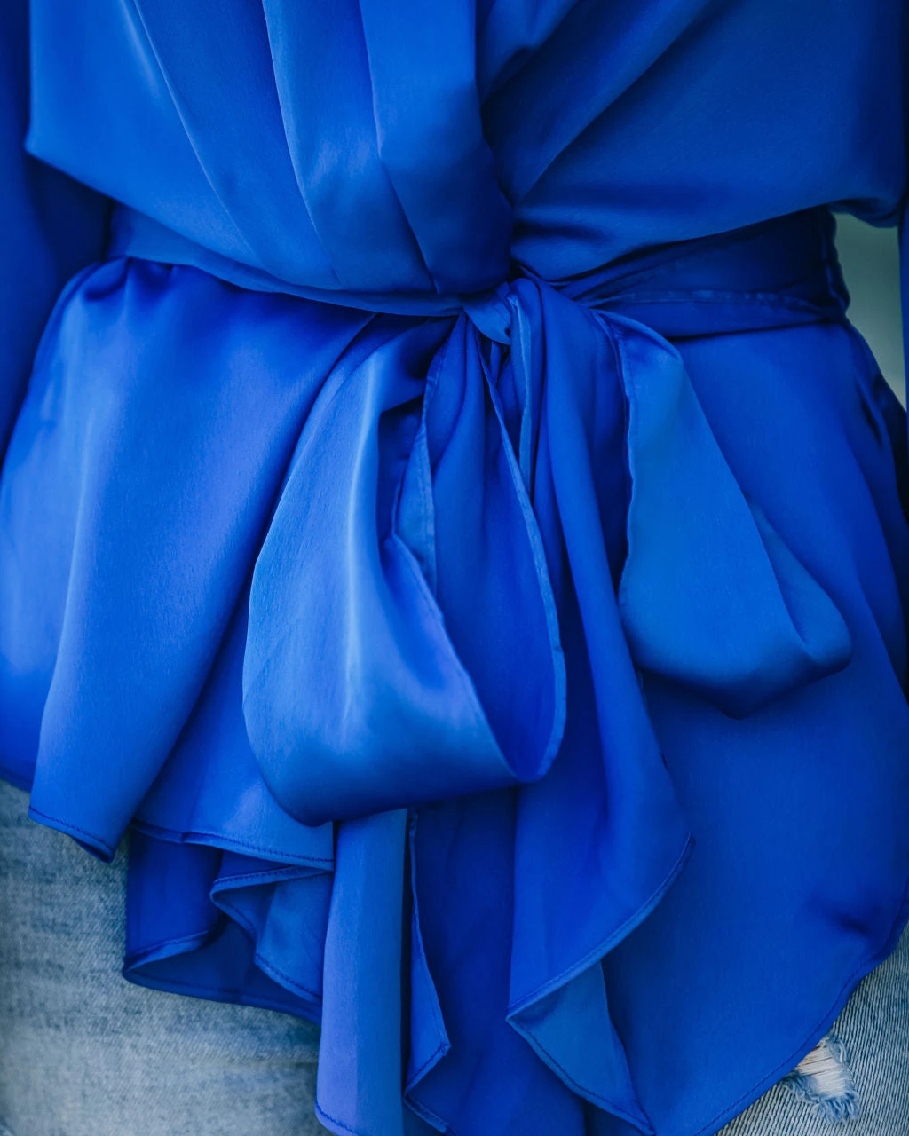 //Best Seller// The Motivation Satin Drape Wrap Blouse embodies a sophisticated chic look in a bright blue satin fabrication with front pleating from the draped neckline to the asymm hemline.