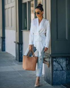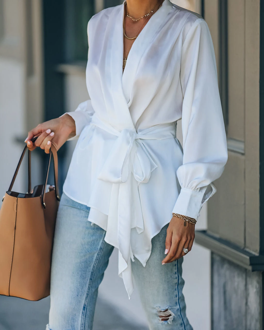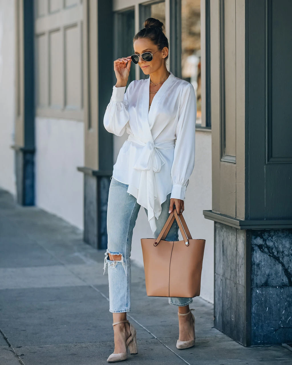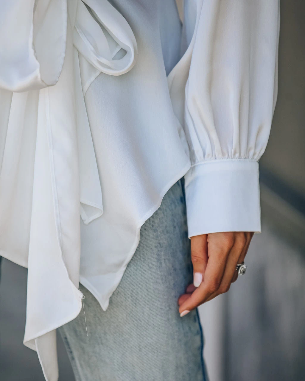 //Best Seller// The Motivation Satin Drape Wrap Blouse embodies a sophisticated chic look in a white satin fabrication with front pleating from the draped neckline to the asymm hemline.