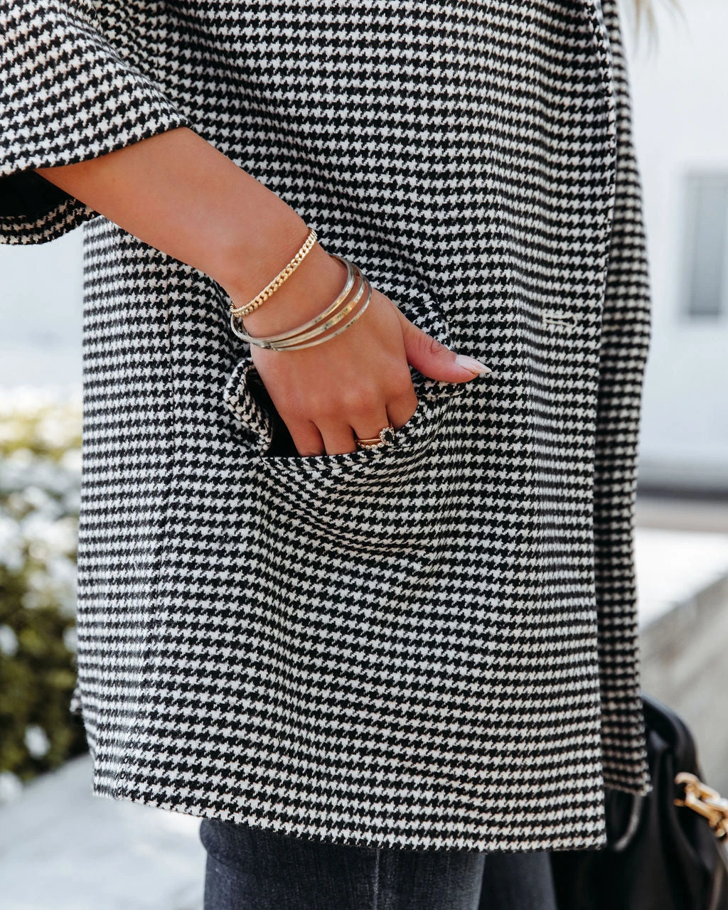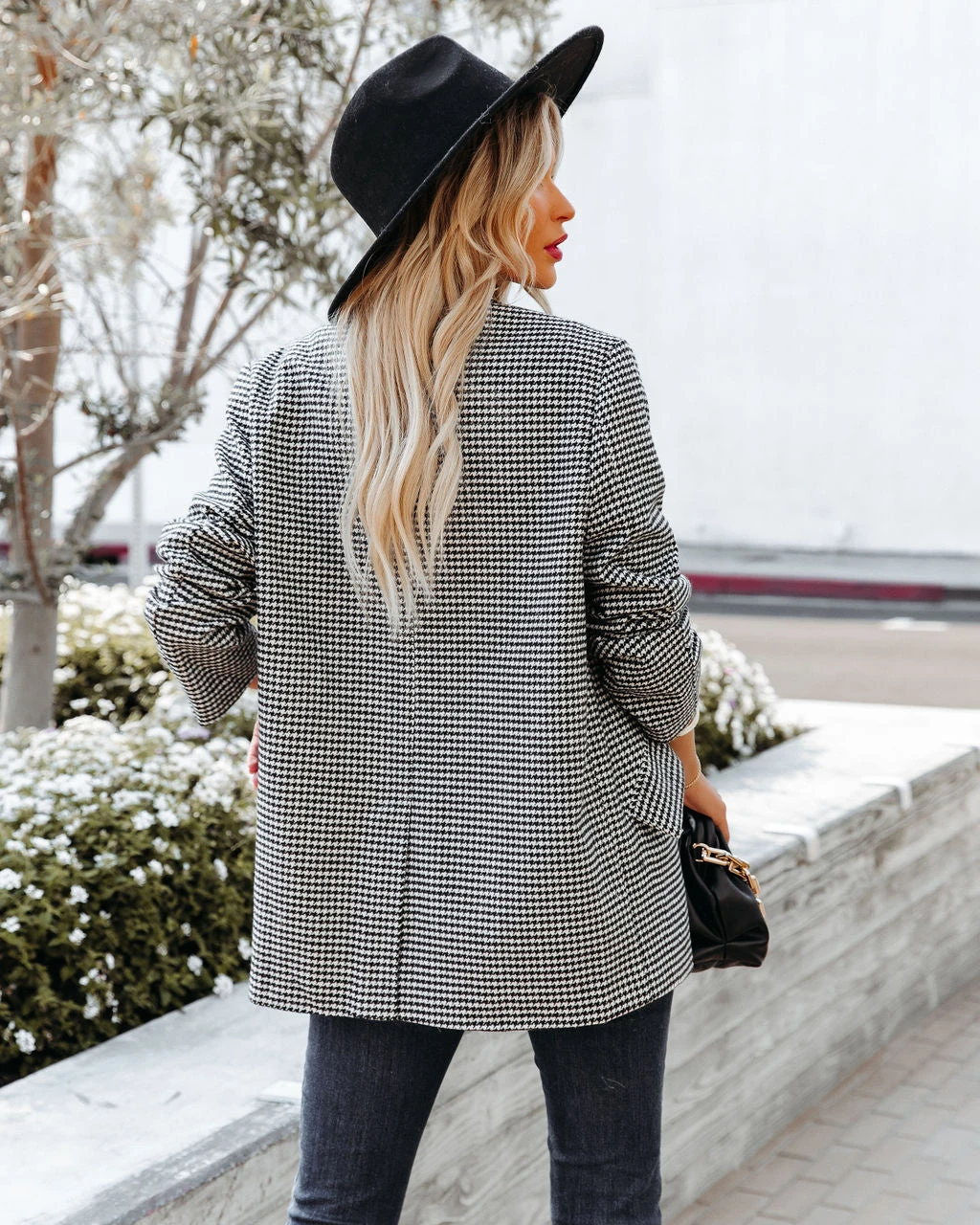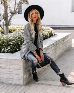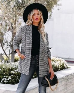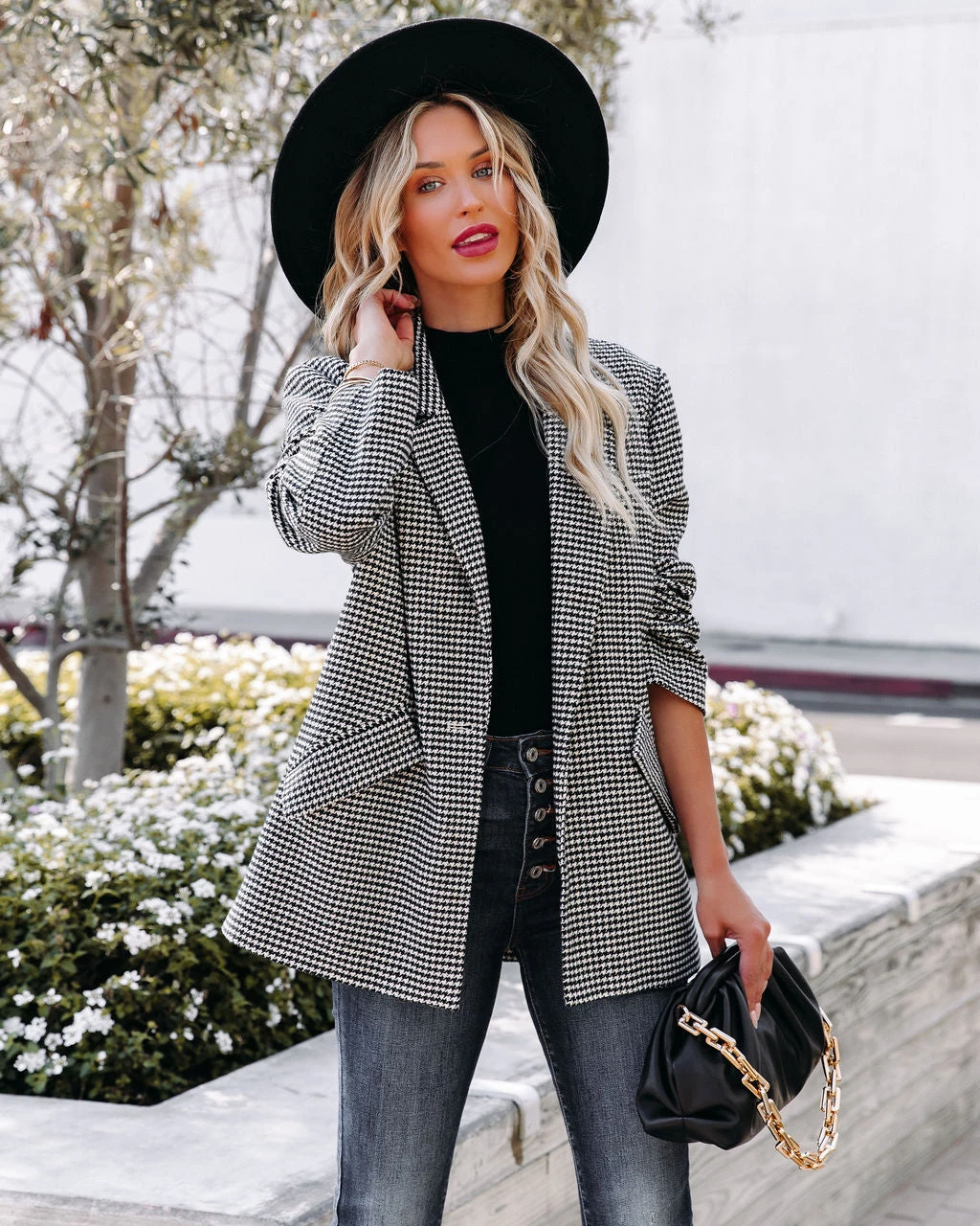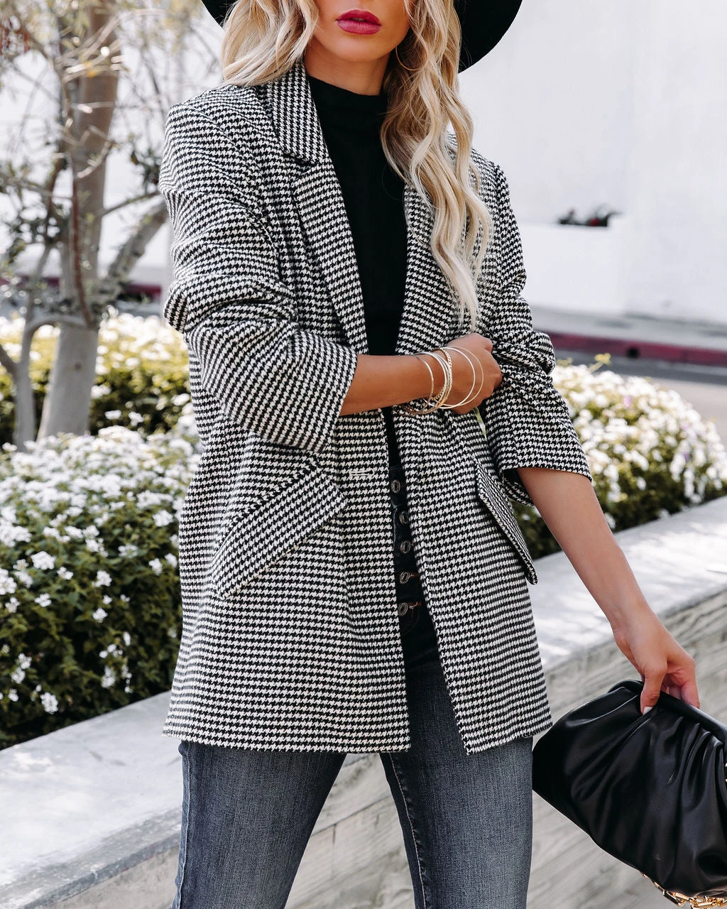 With Fall making in full swing, itโs a good idea to add the At Its Finest Pocketed Houndstooth Blazer to your wardrobe! Cream and black houndstooth checks detail the thick cotton blend base. Designed with a notched collar, front flap pockets and a front closure. A work to weekend-ready piece! Fully lined. Styled with the El Dorado Hat, Perfect Hoop Earrings, Simple Bangle Bracelet, Chic Crossbody Chain Pouch Bag, Tilley Frayed Ankle High Waisted Skinny, Day To Day Turtleneck Knit Top, and Jocelyn Heeled Bootie.ย
