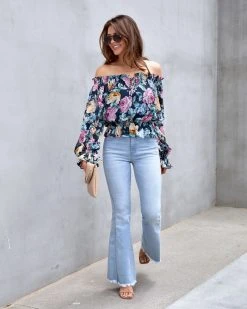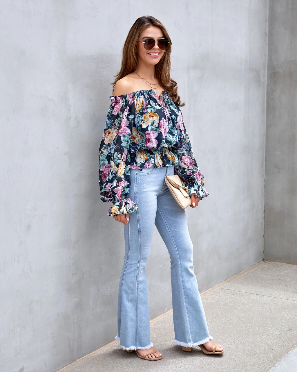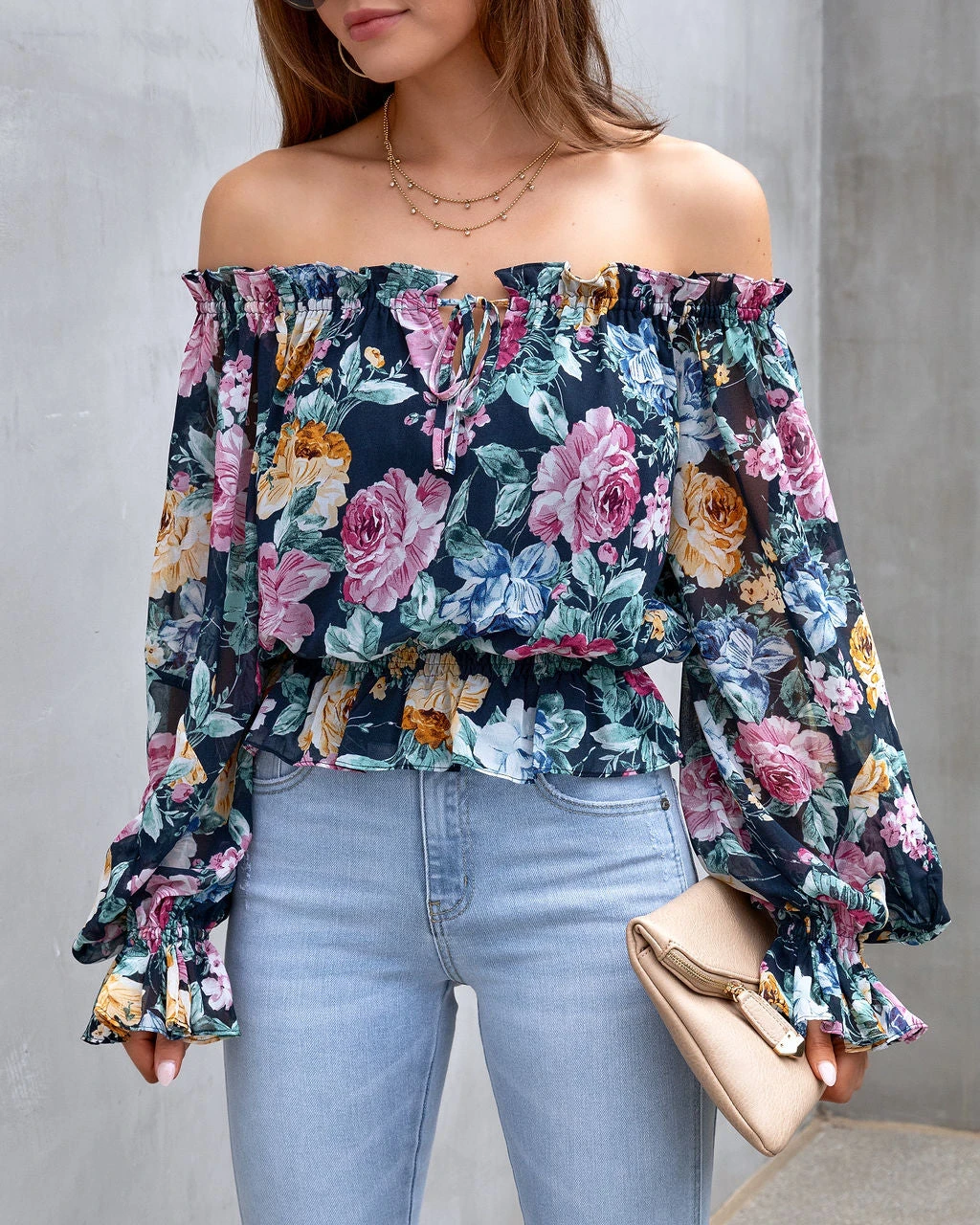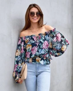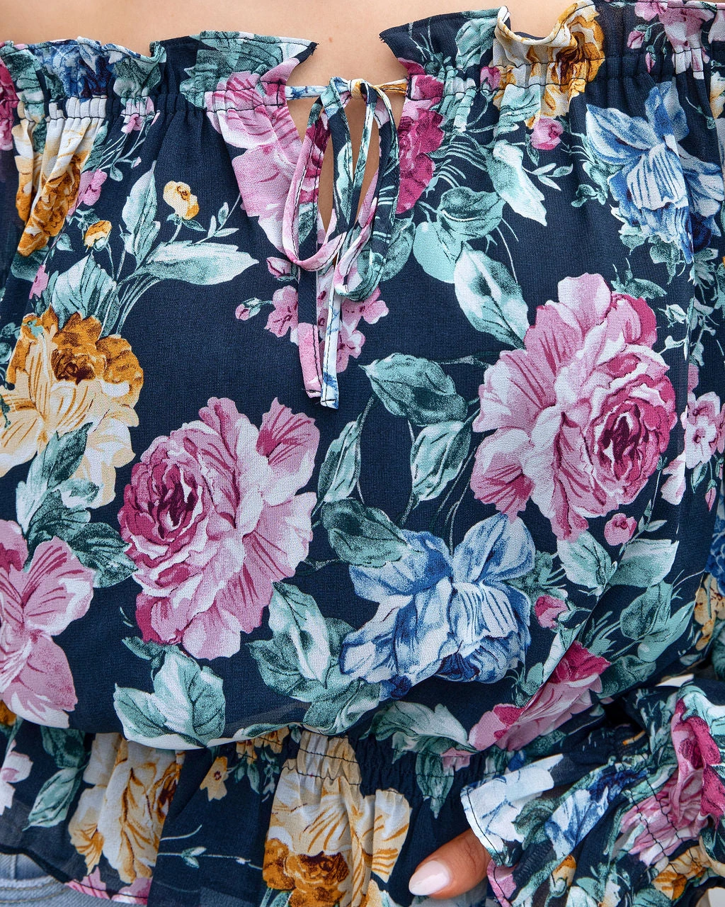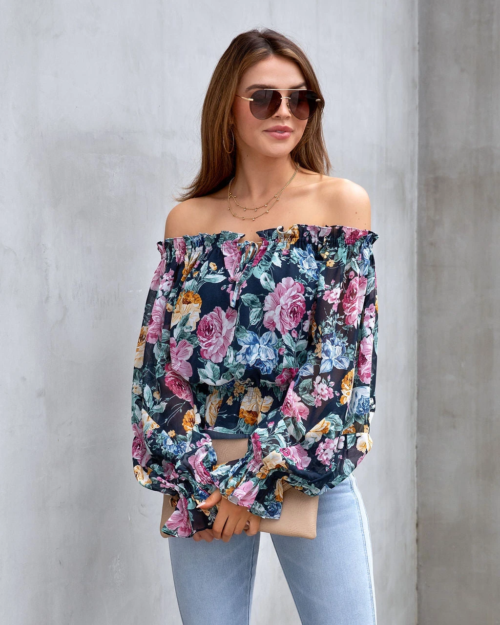 Cute for Summer, the Beautiful Night Chiffon Off The Shoulder Blouse in midnight garden features a neck tie closure.