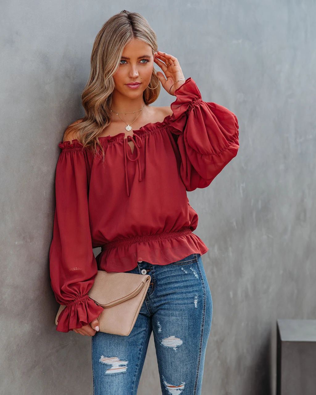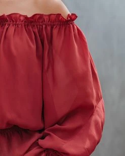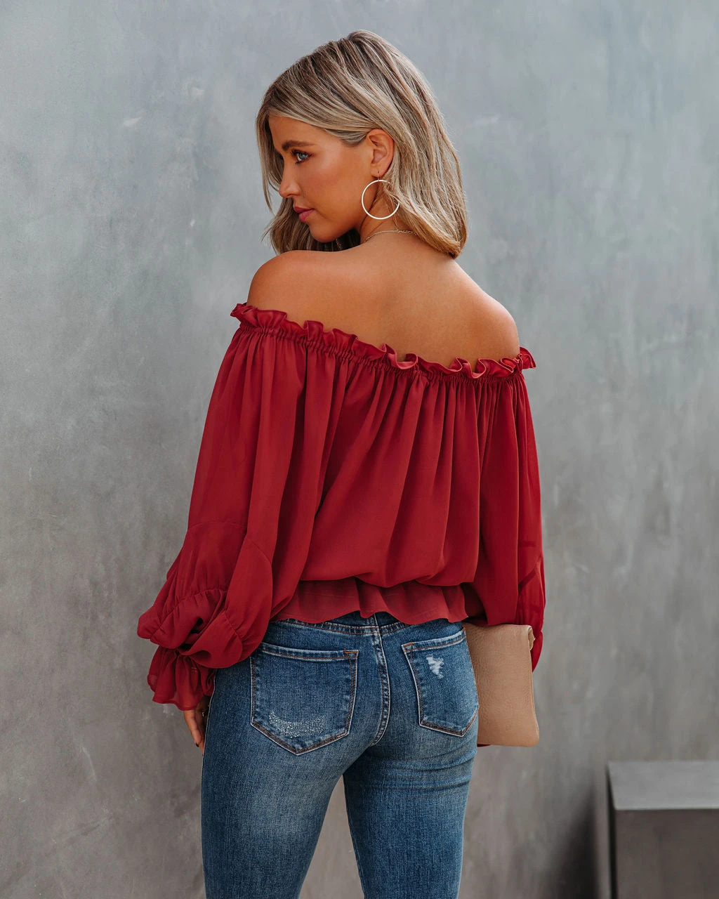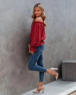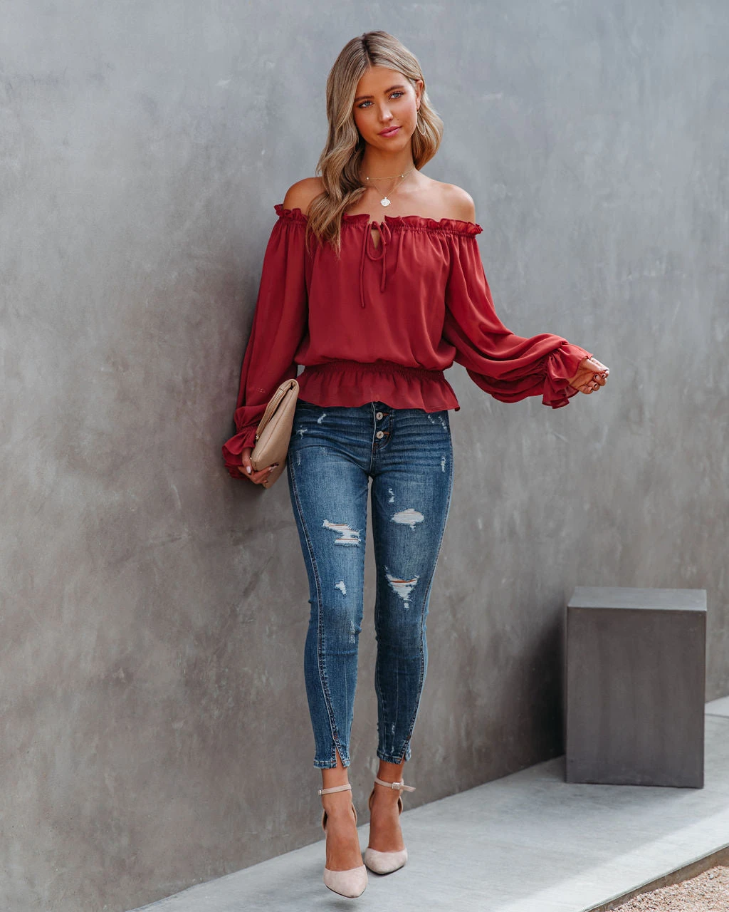 //VICI Exclusive//Best Selling Silhouette// Our Caydence Chiffon Off The Shoulder Blouse is effortlessly adorable! This wine colored top is crafted with a smocked waistband. Finished with a ruffle trimming. Styled with the Perfect Hoop Earrings, 5 Disc Choker, Gaia Coin Necklace, Simple Bangle Bracelet, Lauren Chain Cuff, Stella Crossbody Envelope Zip Clutch, Ultimate High Rise Split Ankle Distressed Skinny, and Ritz Faux Suede Pointed Heel.ย