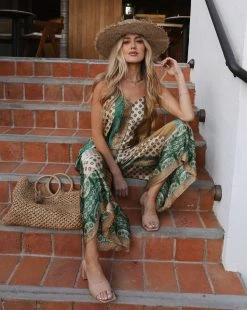 From relaxing at home to out running errands, our Esmeralda Satin Printed Pocketed Jumpsuit can do it all. This relaxed fit silhouette is patched with various multi-color patterns.
