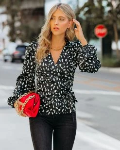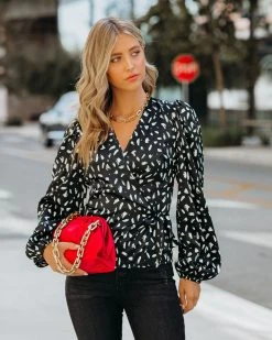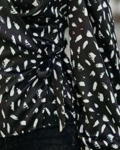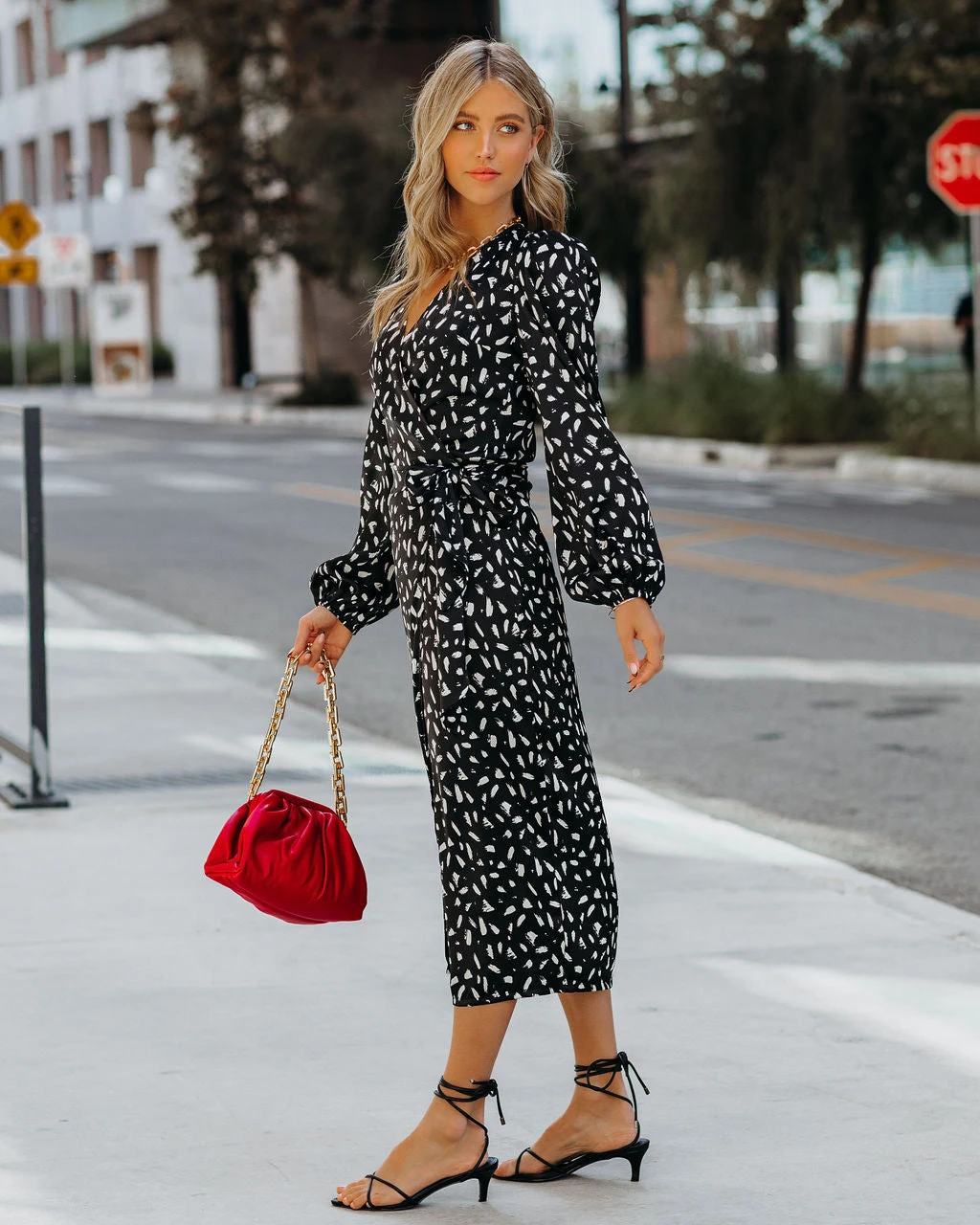 We adore a silk set for an event ready look! Our In Awe Satin Printed Wrap Blouse is black with white spots. Designed with a draped neckline and an adjustable waist tie closure. Styled with the Perfect Hoop Earrings, Jenna Link Necklace, Chic Crossbody Chain Pouch Bag, In Awe Satin Printed Wrap Midi Skirt, Keen High Rise Button Front Skinny, and Whimsy Heel.