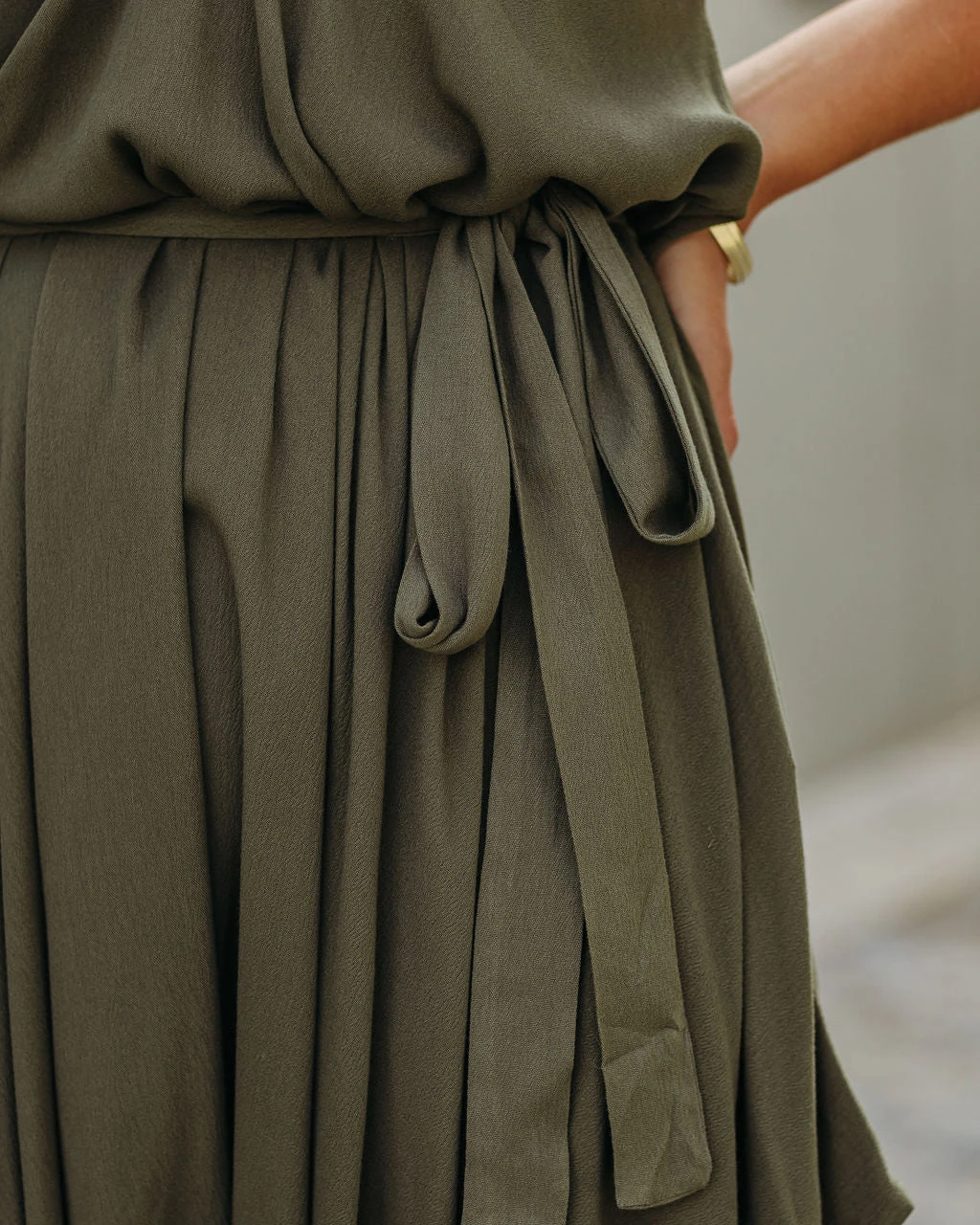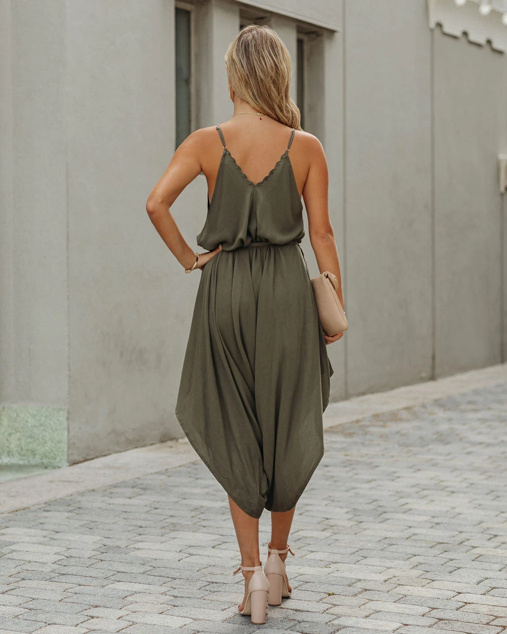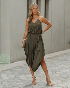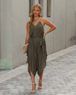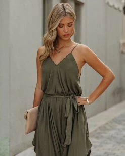 //VICI Exclusive// Stroll the city in our Khari Relaxed Tie Jumpsuit! This dark olive jumpsuit features a relaxed fit and an embroidered trim along the neckline. Secured with an adjustable waist tie. Styled with the Perfect Hoop Earrings, 5 Disc Choker, Gaia Coin Necklace, Simple Bangle Bracelet, Lauren Chain Cuff, Stella Crossbody Envelope Zip Clutch, and Whimsy Heel.