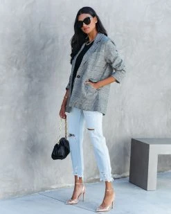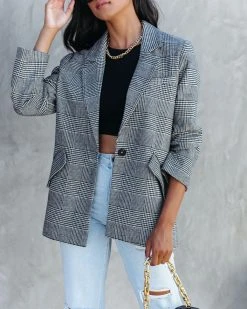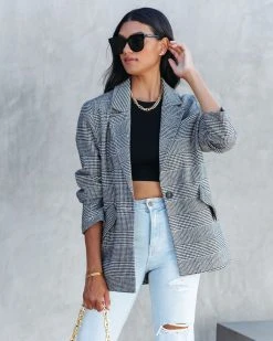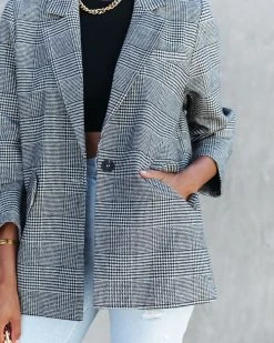 Head into the city in our Markell Cotton Blend Pocketed Houndstooth Blazer! This black and natural plaid blazer features a notched collar.