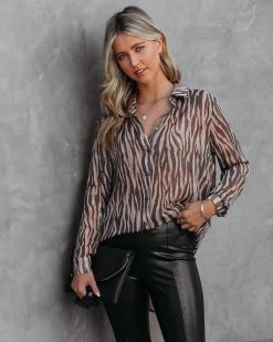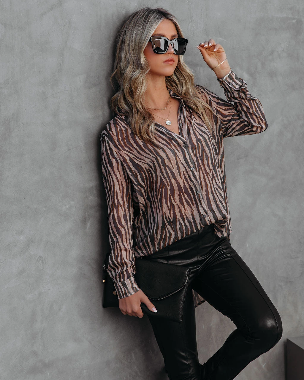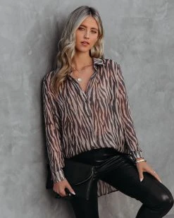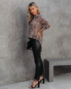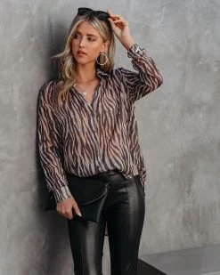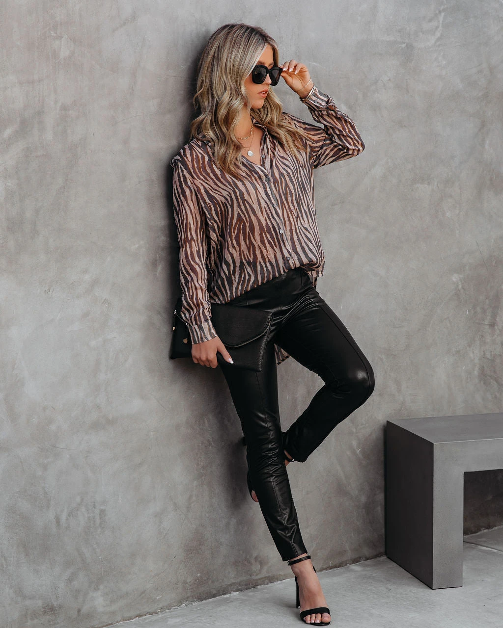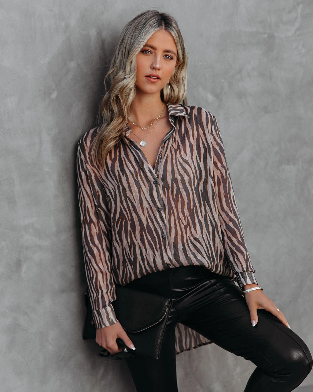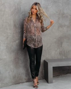 Our Monroe Tiger Print Button Down Blouse features the dreamiest hues! Natural, camel, charcoal, and beige tiger print hues detail this button front blouse. Designed with a rounded hemline. Styled with the Carson Black Frame Dark Smoke Polarized Sunglasses, Perfect Hoop Earrings, Chloe Mini Necklace, Compass Coin Necklace, Simple Bangle Bracelet, Stella Crossbody Envelope Zip Clutch, Sterling High Rise Faux Leather Pants, and Whimsy Heel.