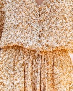 Kimono rompers are such an effortless vibe! Our Run Through The Wind Printed Kimono Romper comes in ivory, gold, and mustard complete with a v-neckline and front buttons. Finished with an adjustable waist tie. Styled with the Rico Straw Sun Hat, Perfect Hoop Earrings, Align Pendant Necklace, Simple Bangle Bracelet, Stella Crossbody Envelope Zip Clutch, and Cooper Block Heeled Sandal.