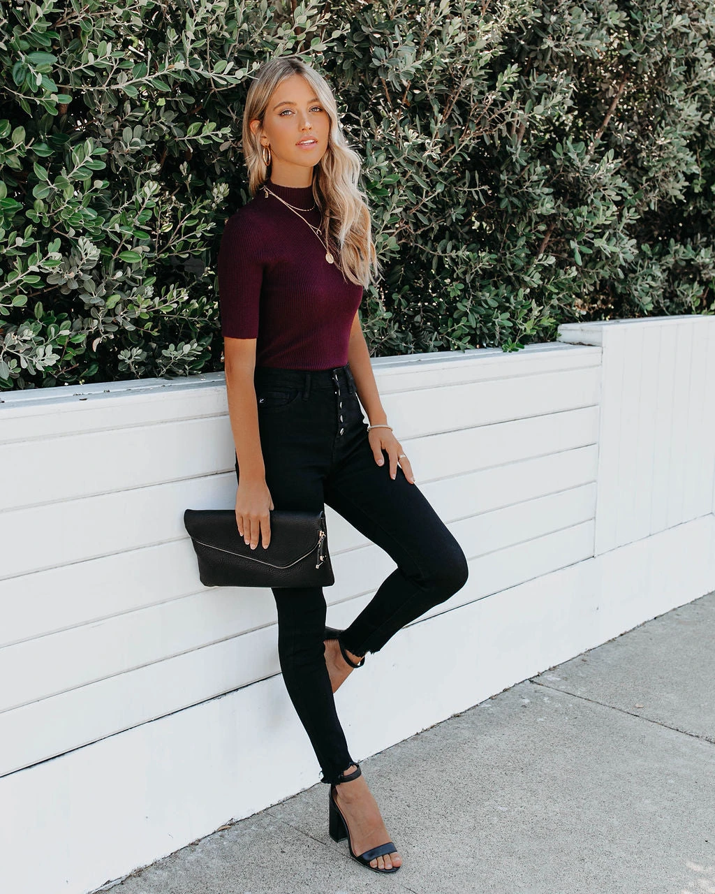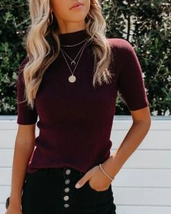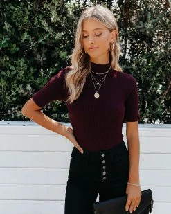 Our September Mock Neck Ribbed Knit Top is a seasonal must-have! Walk into Fall with a soft ribbed knit in a deep burgundy hue. Cut with a mock neckline, short sleeves, and a fitted body. A flattering piece to transition your look!
