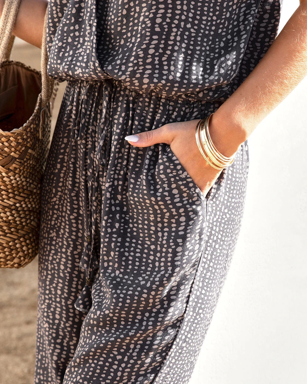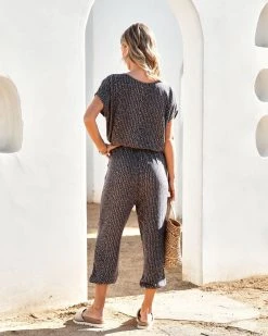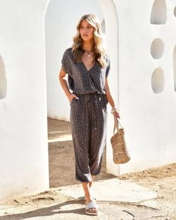 //Best Selling Print// Our Wyland Pocketed Printed Jumpsuit in charcoal is the perfect look! This relaxed fit piece is designed with a surplice neck and a snap button closure.