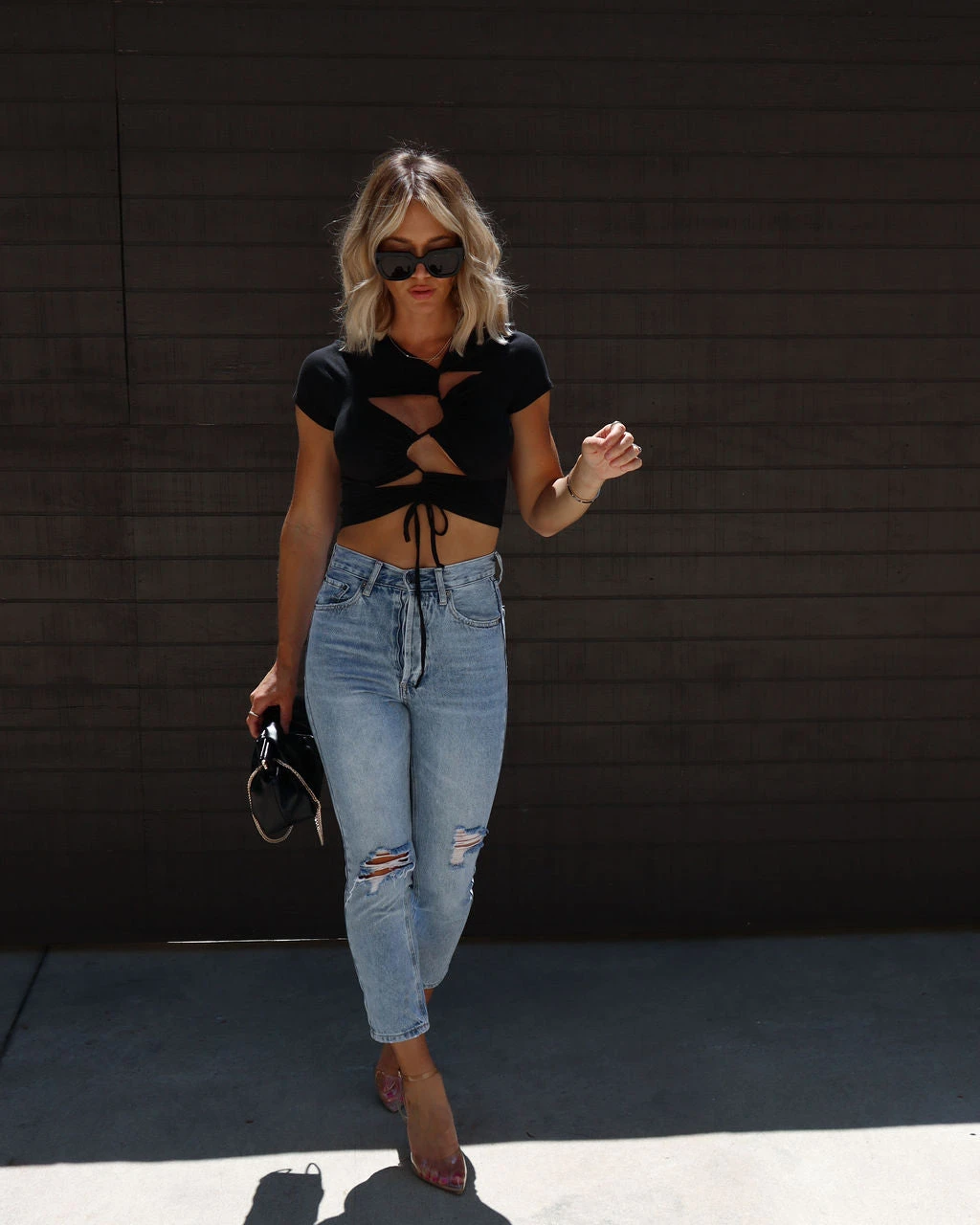 Model is Wearing a Size Small. Height is 5’8″, Bust is 35”, Waist 26”, and Hips 36”