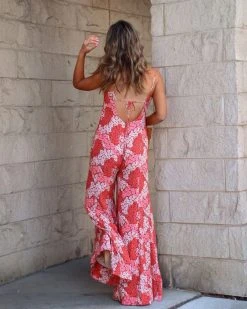 Dress up for your dinner ready in the Very Brady Floral Wide Leg Jumpsuit in rust that features a low neckline.