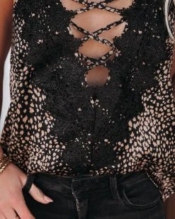 Weβre going crazy for the lace contrast of this cute cami! Our Birkin Printed Lace Up Cami Tank features a black and tan print with a front lace detailing and a semi sheer lace up neckline. Finished with adjustable spaghetti straps. Styled with the Perfect Hoop Earrings, Mica Chain Choker, Mosaic Coin Necklace, Cling Twisted Bangle Bracelet, Volt High Rise Distressed Skinny, and Tour Faux Suede Pumps.Β