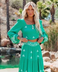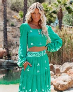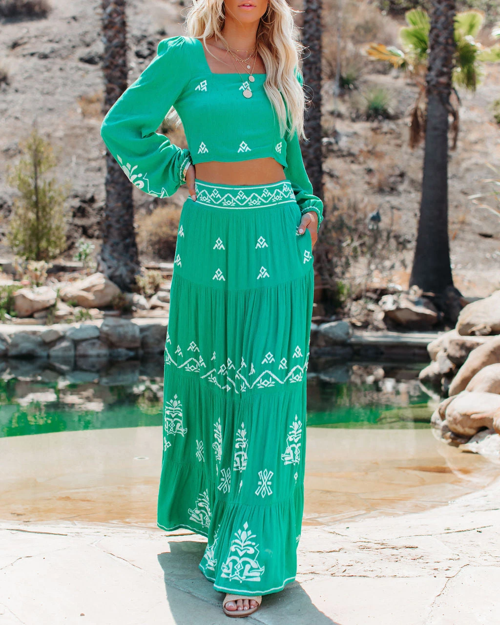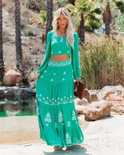 //VICI Exclusive// Turn heads in this stunning green set! Our Kula Embroidered Square Neck Crop Top features a white embroidered swiss dot detailing and a concealed side zipper. Styled with the Perfect Hoop Earrings, 5 Disc Choker, Chloe Mini Necklace, Emperor Coin Necklace, Simple Bangle Bracelet, Kula Pocketed Embroidered Maxi Skirt, and Leila Block Heeled Sandal.