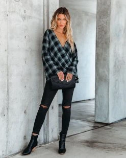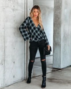 //VICI Exclusive// Lonzo Cotton Plaid Bell Sleeve Top pairs best with fitted black denim! This black and light blue plaid top features a draped front. Designed with bell sleeves. Styled with the Perfect Hoop Earrings, Carmyn Layered Necklace, Stella Crossbody Envelope Zip Clutch, Gossip Layered Chain Belt, Volt High Rise Distressed Skinny, and Jocelyn Heeled Bootie.