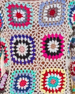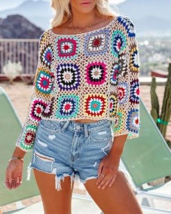 //Best Seller// New Color// Right on trend is the Mind Soul Spirit Crochet Crop Top in cream with white, magenta, cobalt, wine, yellow, turquoise, orange, green, neon coral and light blue hues.Â