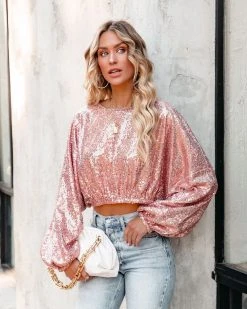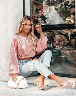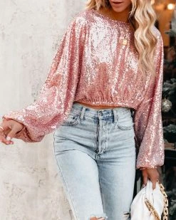//VICI Exclusive// Our Sequin Sweetheart Billowed Crop Blouse is ready for a GNO! This rose gold sequin top features a billowed style. Designed with a crew neckline and an elastic waistband. Styled with the Perfect Hoop Earrings, Chloe Mini Necklace, Initial Card Necklace, Chic Crossbody Chain Pouch Bag, Kason Distressed High Rise Denim, and Pia Clear Strap Heel.