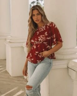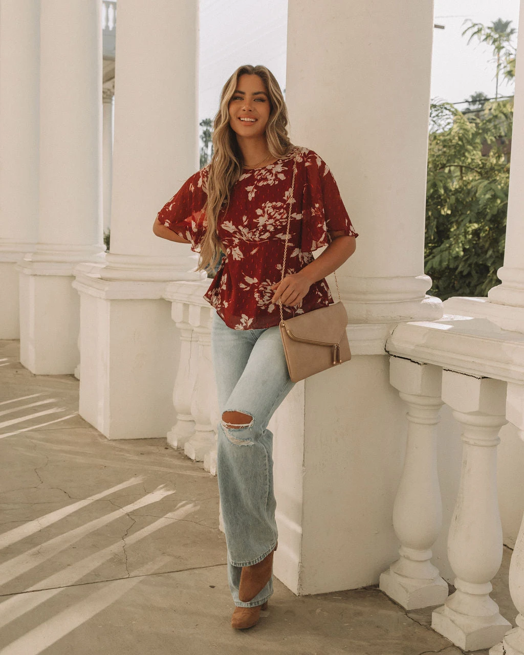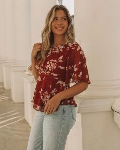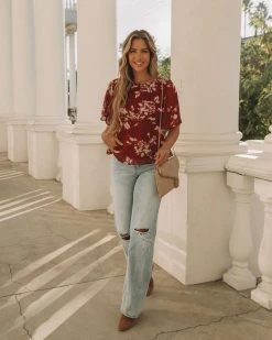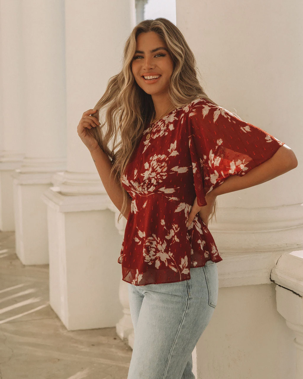 Embody everyday romance in our Sidney Floral Shimmer Peplum Blouse! This wine colored top features shimmer gold and silver florals. Designed with flutter sleeves and a crew neckline. Styled with the Emperor Coin Necklace, Minimal Herringbone Necklace, Stella Crossbody Envelope Zip Clutch, Nia High Rise 90’S Flare Denim and Colby Faux Suede Heeled Bootie.
