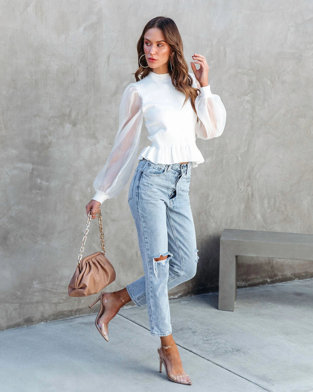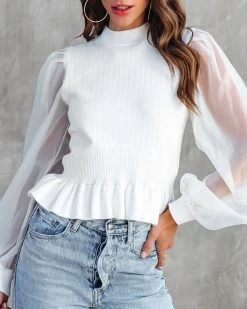 Dress up for the holidays in the Alessandra Sheer Knit Contrast Top in ivory that features a high neckline.