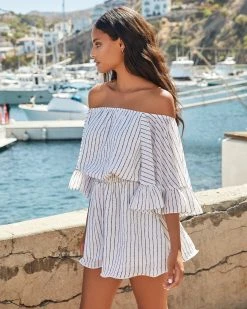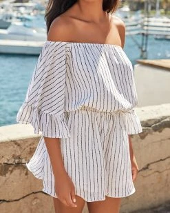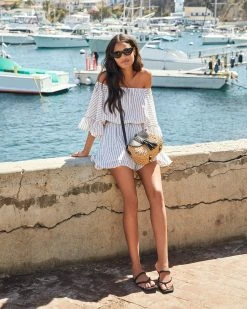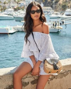 Spend days exploring in our Astern Striped Off The Shoulder Romper! This ivory and black striped piece is detailed with half sleeves and an elastic waistband. Pair this flirty piece with tan sandals! Styled with the Iva Cat Eye Sunglasses, Hillock Rattan Tassel Crossbody Bag, and Chantal Square Toe Sandal.