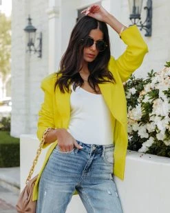 Standout from the crowd in the Beaming Cotton Pocketed Blazer in yellow with front flap pockets and front button closures.Â