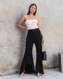 Chic meets comfy in the Cherie Colorblock Flare Jumpsuit in beige and black that features a flattering fit. Â