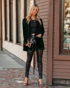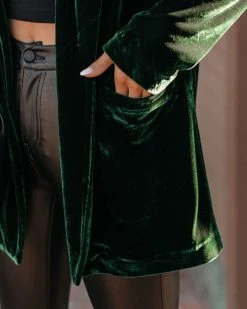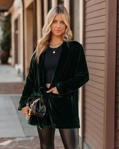 //Best Seller// New Color// Get your hands on our Chicest Pocketed Velvet Blazer! This green pocketed velvet blazer is decorated with subtle shoulder pads. Finished with front button closures. Style with the Mercury Hoops, Minimal Herringbone Necklace, Chloe Mini Necklace, Compass Coin Necklace, Simple Bangle Bracelet, Chic Crossbody Chain Pouch Bag, Kiki Knit Crop Top, Estelle High Rise Faux Leather Skinny, and Whimsy Heel.