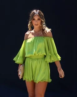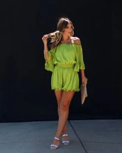 - Size XS: Length measures 27” from neckline to hem with a 2.5” inseam, 34” bust and 24” waist with stretch