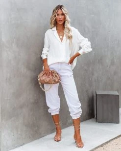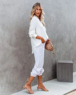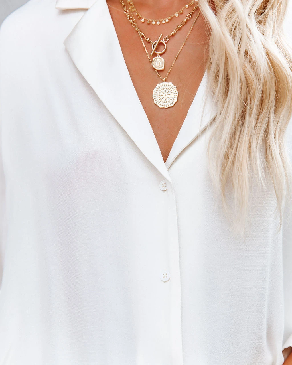 //VICI Exclusive// Our Demi Satin Detailed Button Down Blouse is work ready! This ivory button down blouse is detailed with a notched collar and sleeve cuffs. Tuck this boss babe top into high waisted denim paired with heels. Styled with the Blair Beaded Statement Earrings, Mosaic Coin Necklace, Chloe Mini Necklace, Sia Toggle Pendant Necklace, Simple Bangle Bracelet, Chic Crossbody Chain Pouch Bag, Mara Vintage Wash Denim Joggers, and Bella Faux Leather Strappy Kitten Heel.