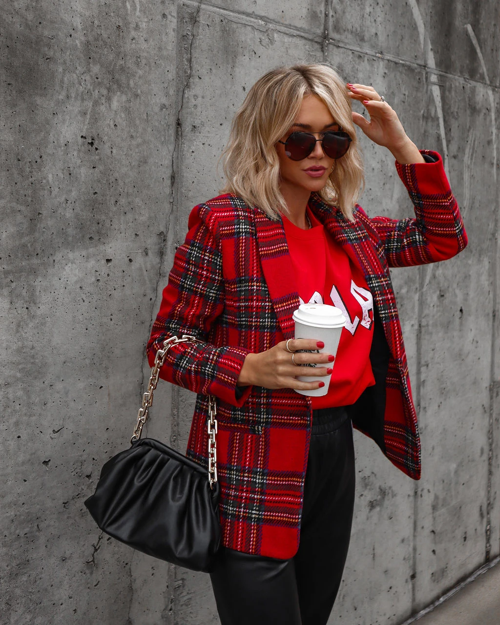 //VICI Exclusive// We’ve found your holiday party outfit! Our Eve Pocketed Plaid Blazer features red, hunter green, black, cobalt, yellow, and white plaid hues. Padded shoulders give this piece a business-like vibe. Styled with the Chloe Mini Necklace, Compass Coin Necklace, Simple Bangle Bracelet, Chic Crossbody Chain Pouch Bag, Physique Racerback Tank, Universal Mid Rise Distressed Skinny, and Whimsy Heel.