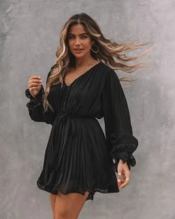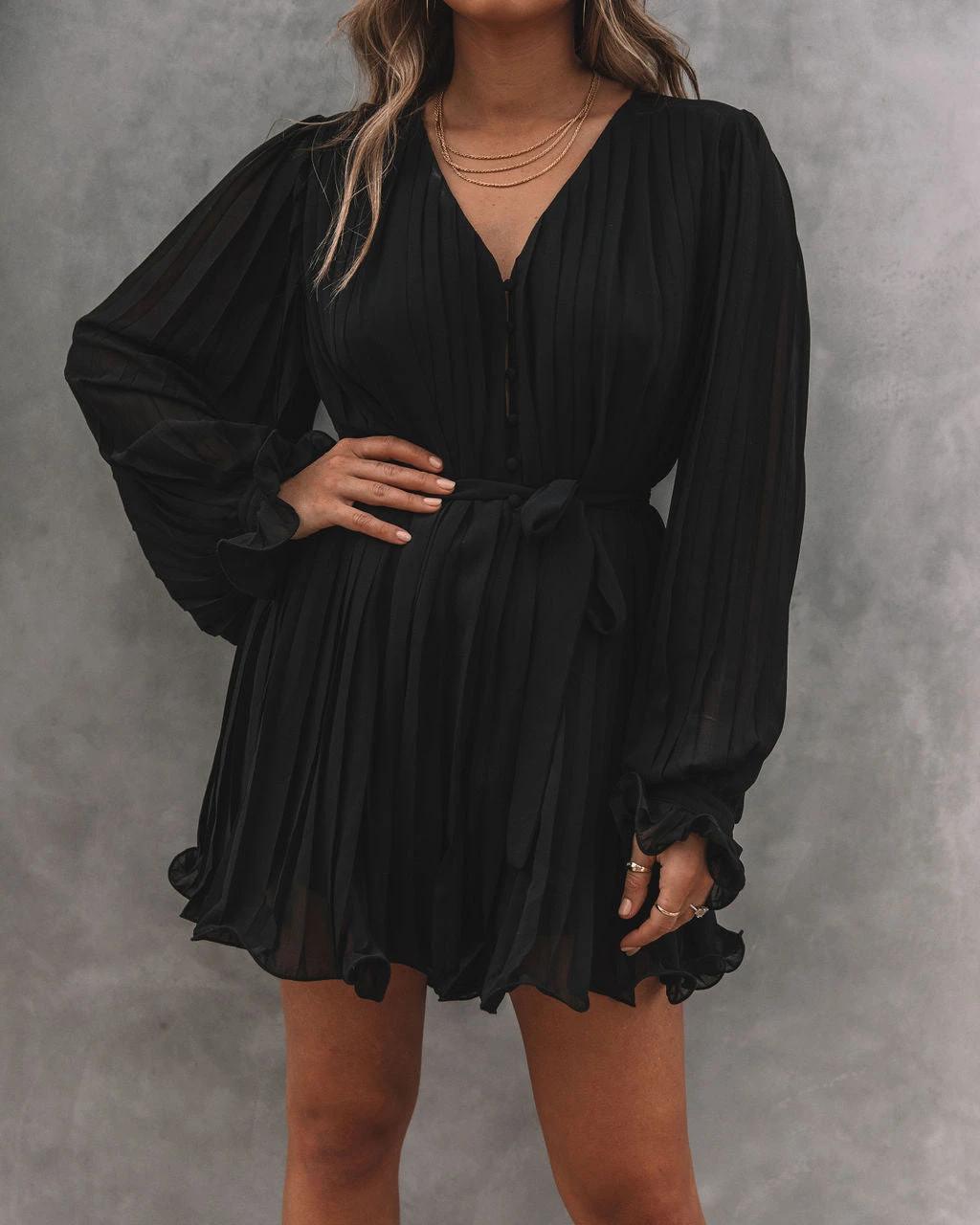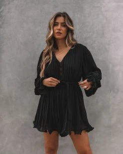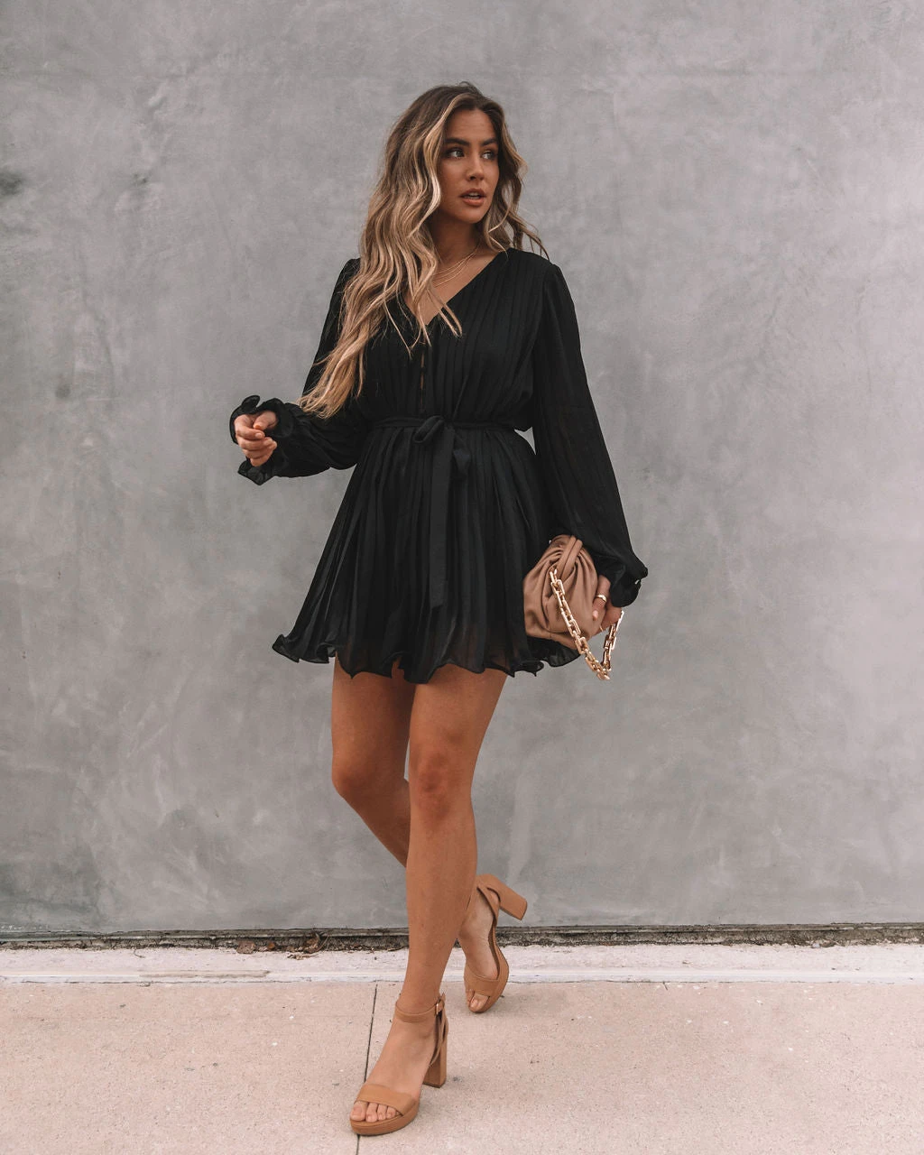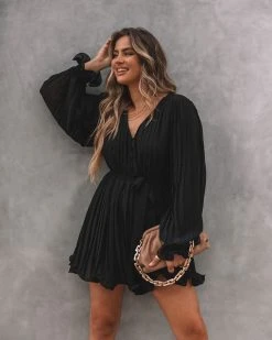 //Best Seller// Romance is calling in our Found Love Pleated Romper! Featuring a fully pleated black fabrication. Designed with a v-neckline, cuffed long sleeves and a button down front closure. The billowy fit accentuates at the waist with an adjustable fabric tie. This flirty ensemble finishes with a curly ruffle trimmed hemline. Styled with the Layers Of My Heart Necklace, Chic Crossbody Chain Pouch Bag, and Go On Faux Leather Heeled Platform Sandal.