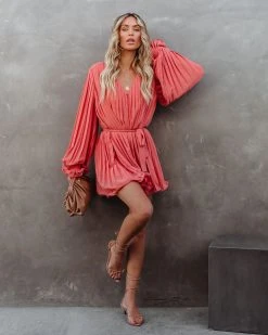 //VICI Exclusive//Best Seller// New Color// Romance is calling in our Found Love Pleated Romper! Featuring a fully pleated mauve fabrication. Designed with a v-neckline, cuffed long sleeves and a button down front closure. The billowy fit accentuates at the waist with an adjustable fabric tie. This flirty ensemble finishes with a curly ruffle trimmed hemline. Styled with the Chloe Mini Necklace, The Buddha Wheel Necklace, Chic Crossbody Chain Pouch Bag, and Bella Faux Leather Strappy Kitten Heel.