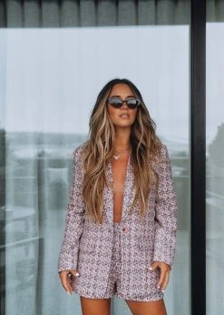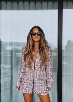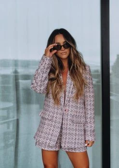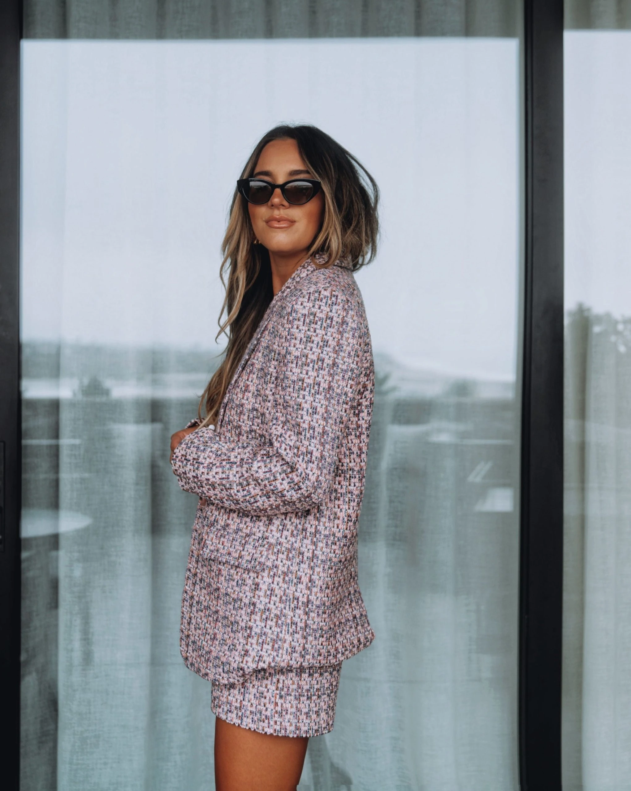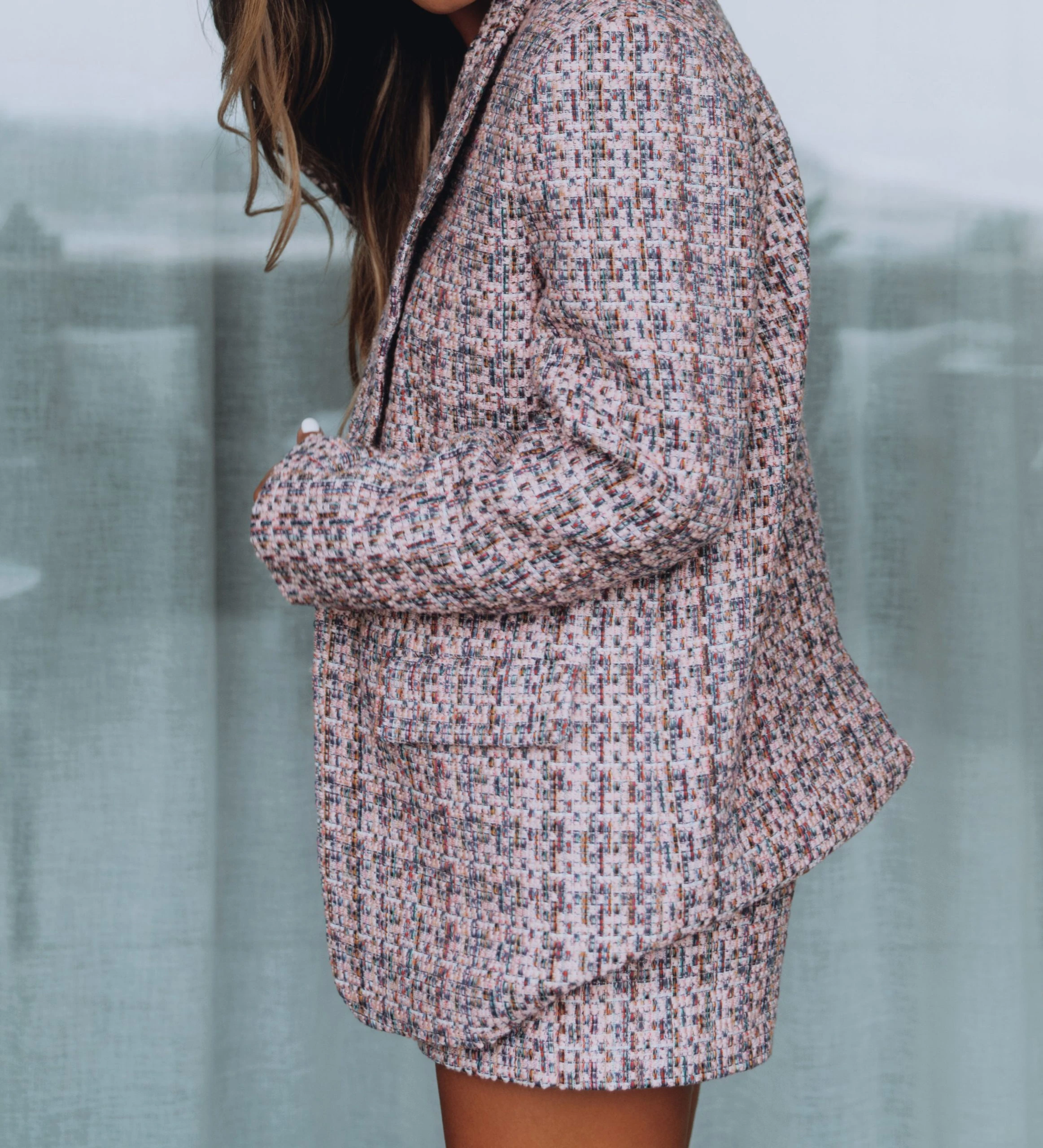 We’re obsessed with the Clueless vibes of the House Of Style Tweed Pocketed Blazer in pink multi that features padded shoulders.