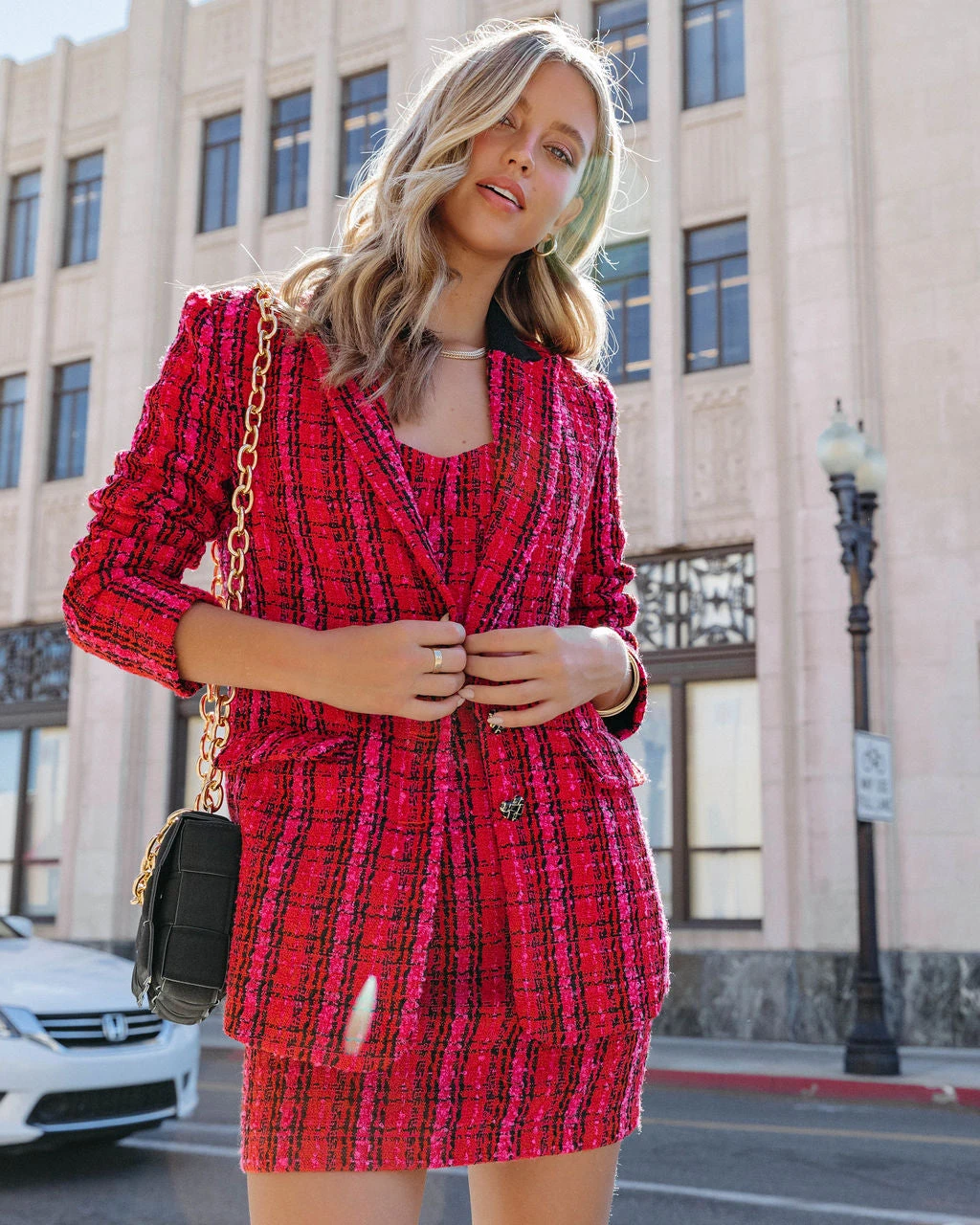 Festive meets fun in the Just Like Me Tweed Pocketed Plaid Blazer in red multi that features flap pockets.