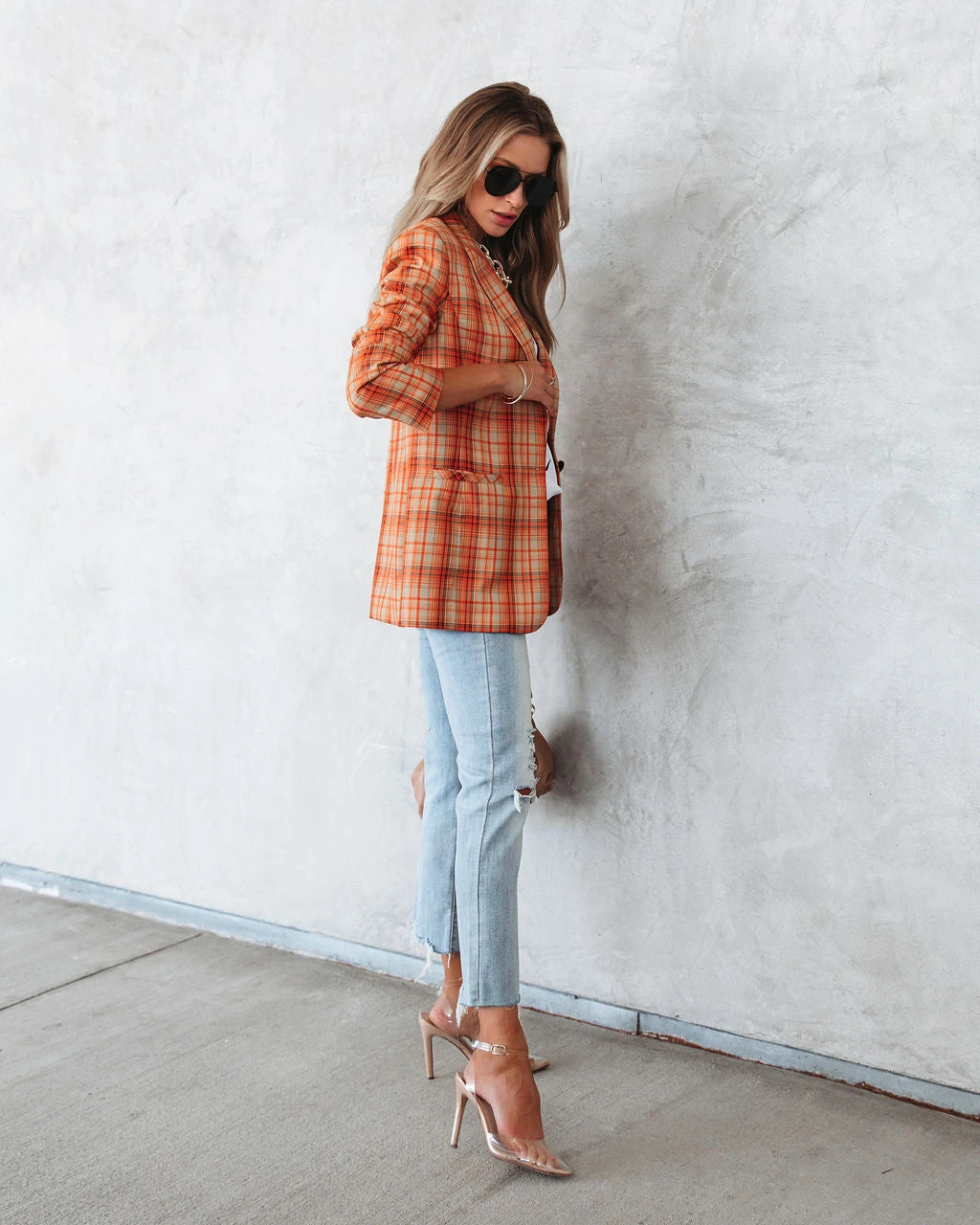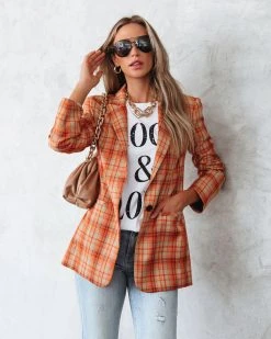 Go for groovy in the Making Headlines Plaid Pocketed Blazer in orange multi that features padded shoulders.