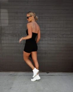 - Size XS: Length measures 30” from shoulder to hem with a 1.5” inseam, 34” bust and 24” waist