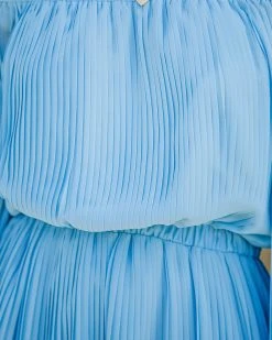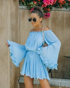 //Best Seller// Make a statement all spring long in our Smile Wide Pleated Off The Shoulder Romper! This striking powder blue piece has an off the shoulder neckline and a ruffle trim in a relaxed fit. Styled with the Chloe Mini Necklace, Amour Heart Pendant Necklace, Chic Crossbody Chain Pouch Bag, and Teigan Chain Strap Heel.