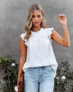 Our Taurus Ruffle Top is so charming! This white top features a black ruffle trimming on the neck and sleeves. Designed with a crew neckline. Secured with a back keyhole and neckline button closure. Styled with the Tahiti Hoops, Minimal Herringbone Necklace, 5 Disc Choker, Stella Crossbody Envelope Zip Clutch, Mcguire High Rise Distressed Denim, and Ritz Faux Suede Pointed Heel.