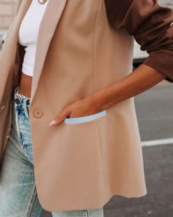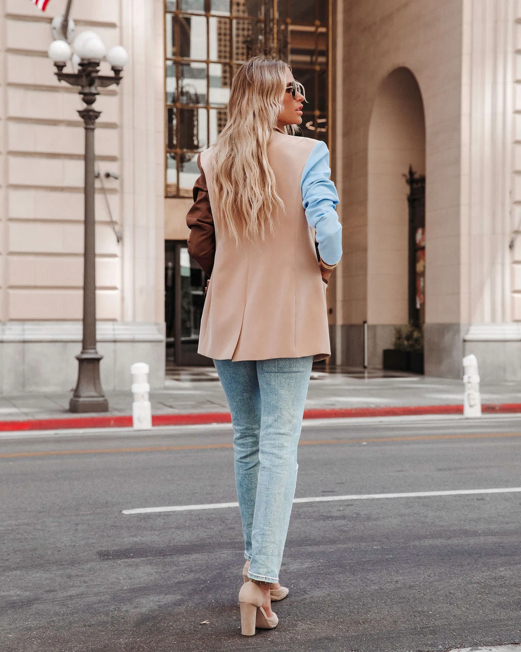 Switch up your style in the This Or That Pocketed Colorblock Blazer in beige multi that features a notched collar.
