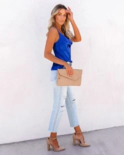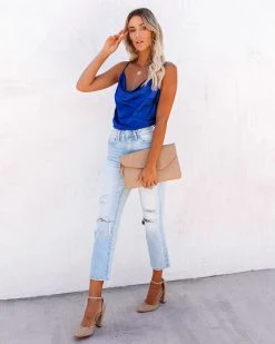 //Best Seller// Look flawlessly chic in the Trisha Satin Cowl Neck Tank designed in a cobalt blue hue that’s draped at the neckline with adjustable straps.