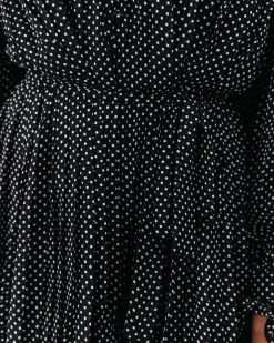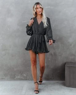 //Best Seller// New Color// The Viera Polka Dot Pleated Romper – she’s sassy and ready to move! Featuring a black body with white polka dots topping a relaxed, billowy silhouette. Fashioned with a button down front, removable + adjustable waist tie and balloon sleeves with ruffled cuffs. Detailed with overall pleating and finished with a ruffle hemline. Styled with our Chic Crossbody Chain Pouch Bag and Whimsy Heel.