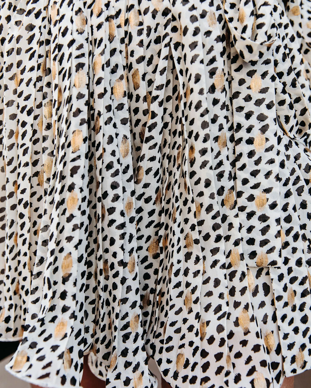 Grab the You’re Golden Pleated Romper before it sells outs! This trendy piece features a fully pleated black and white printed fabrication with metallic gold detailing. Designed with a v-neckline, cuffed long sleeves and front button closures. The billowy fit accentuates at the waist with an adjustable fabric tie. This flirty ensemble finishes with a curly ruffle trimmed hemline. Pull your hair back and slide on your heels because you’re going out tonight! Styled with the Hope Hoops, Twisted Chain Necklace, Virtue Coin Medallion Necklace, Stella Crossbody Envelope Zip Clutch, and Whimsy Heel.