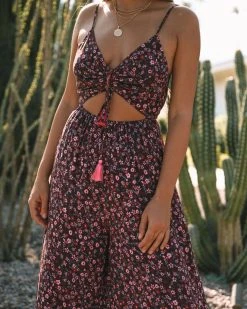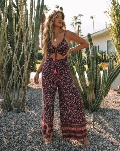 //Best Selling Print// Our Priority Printed Cutout Jumpsuit breezes from summer to fall! This chocolate jumpsuit is detailed with pink, wine, rust, and dusty blue florals. Finished with a front cutout. Styled with the Emperor Coin Necklace and Layers Of My Heart Necklace.Β
