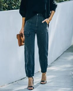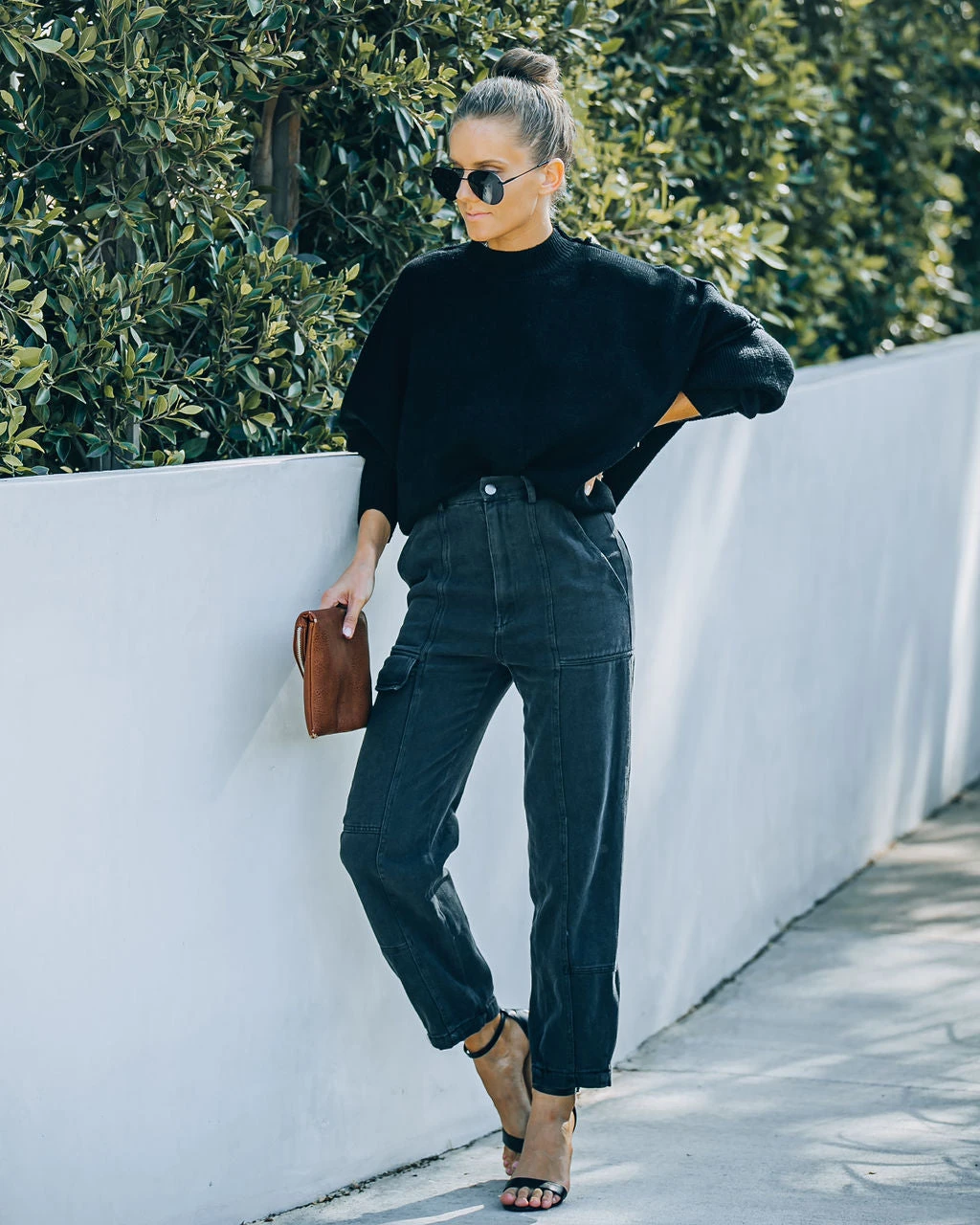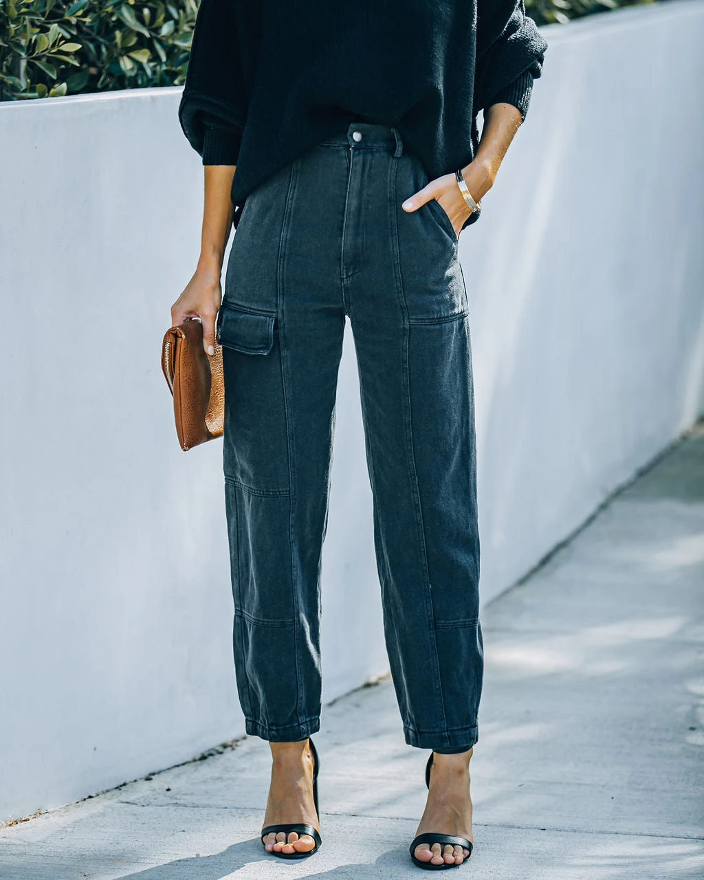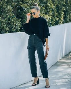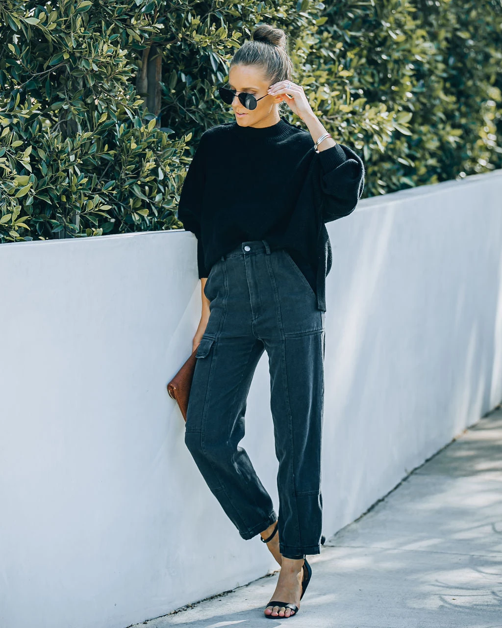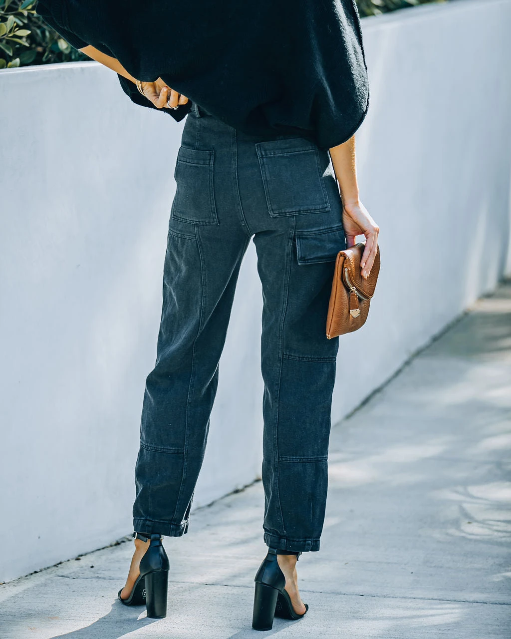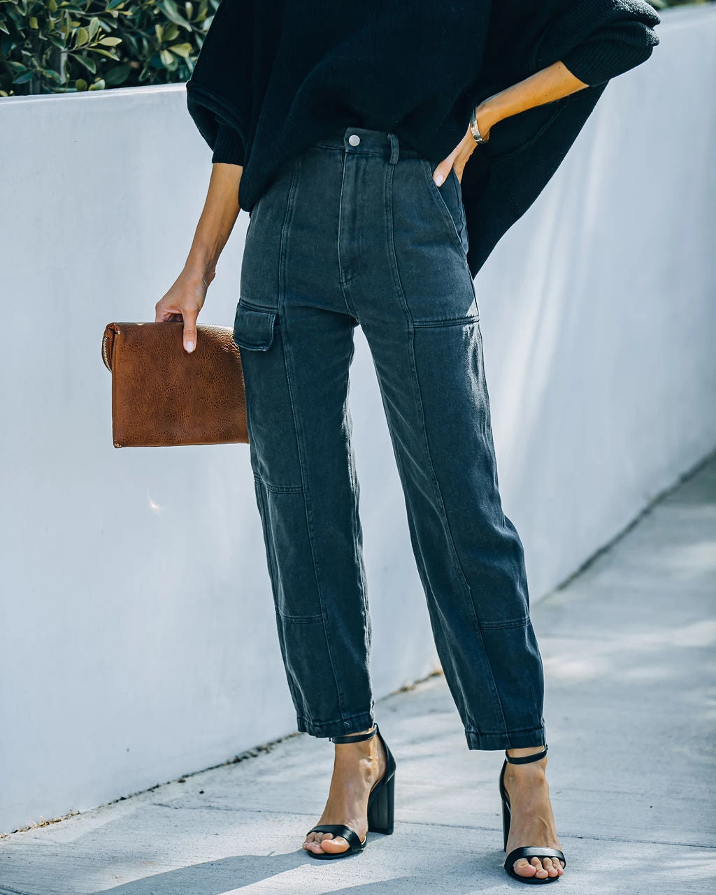 Look effortlessly cool in our Randie Pocketed Denim Cargo Pants! These faded black pants pair best with an oversized sweater. Designed with a straight leg and no stretch. Finished with a front button and zipper closure. Styled with the Lenox Black Frame Grey Gradient Aviator Sunglasses, Simple Bangle Bracelet, Dariel Relaxed Knit Sweater, and Whimsy Heel.