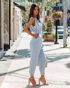 Event ready, the Skyler Pocketed Drape Jumpsuit in blue is so chic with a draped neckline and an adjustable waist tie closure.