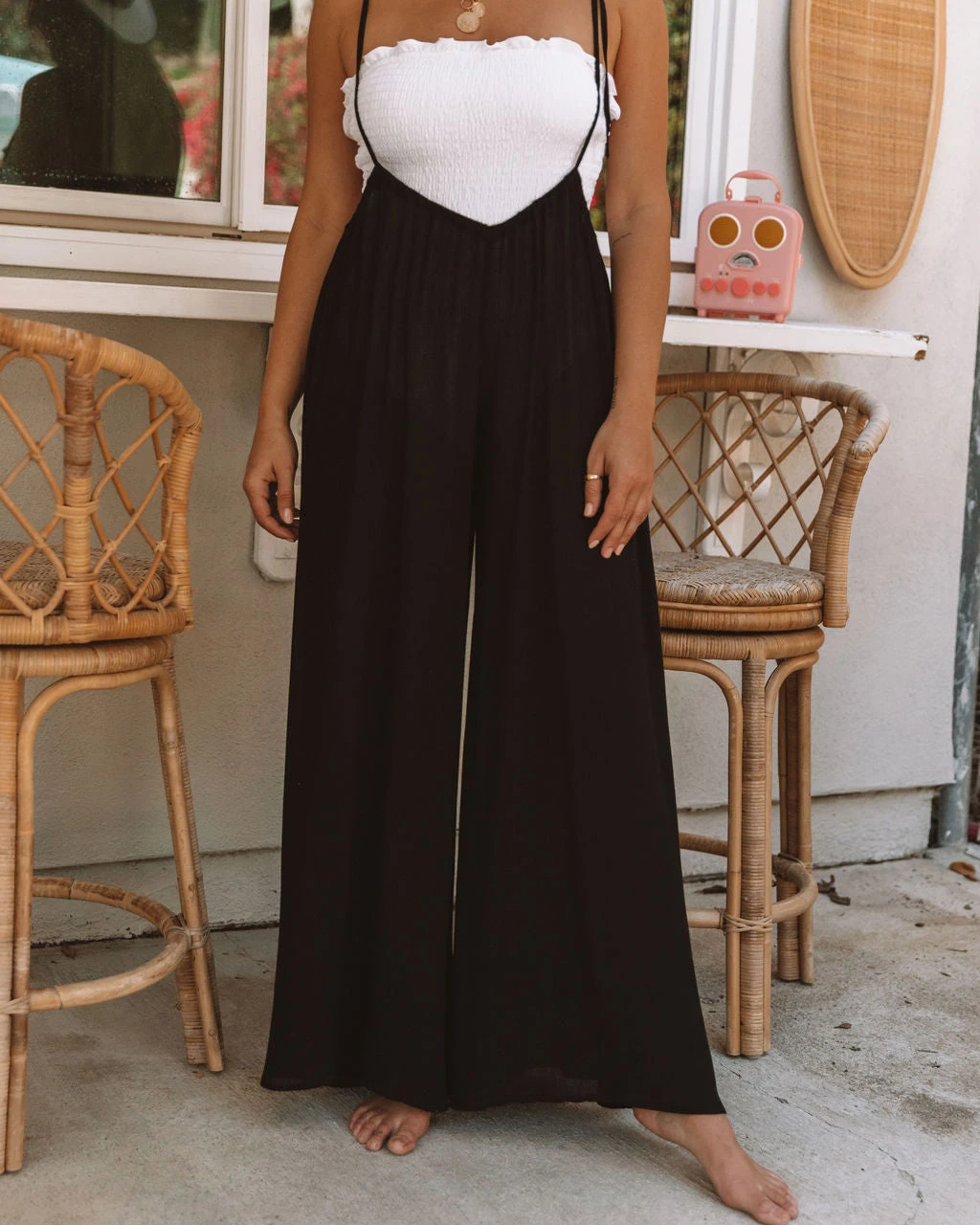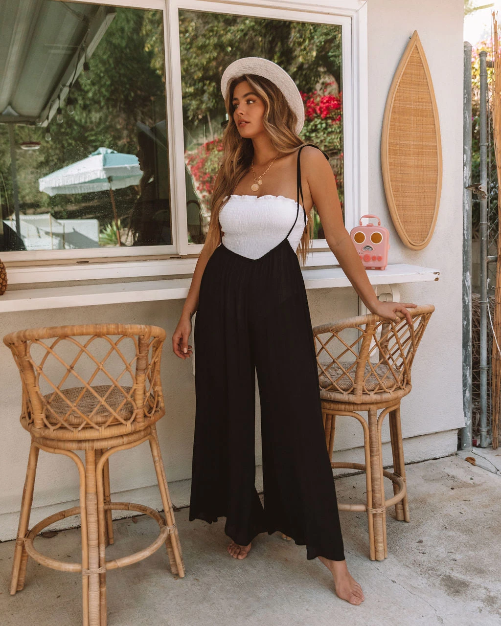 //VICI Exclusive// Made for wandering around a beach town, the Madison Woven Tie Overalls with ultra-wide flowy pant legs set the relaxed tone in the black crepey fabrication.Β