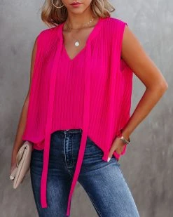 Try a billowy blouse with dark wash denim! Our All That Matters Pleated Sleeveless Blouse comes in a bright hot pink hue. Designed with a split neckline with an adjustable necktie closure. Styled with the Perfect Hoop Earrings, Shayne Gold Link Necklace, Compass Coin Necklace, Simple Bangle Bracelet, Stella Crossbody Envelope Zip Clutch, Jenna High Rise Skinny, and Ritz Faux Suede Pointed Heel.ย