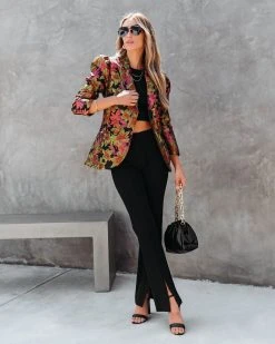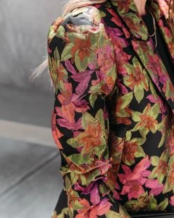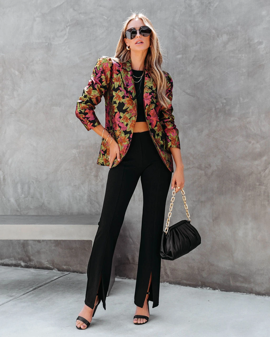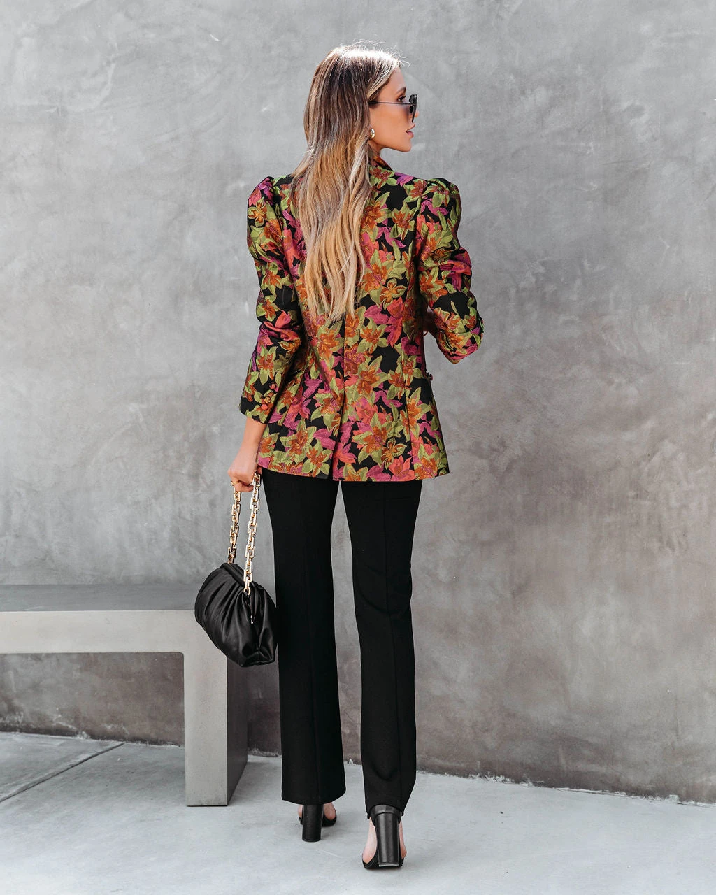 Elevate your office wear in the Caught In A Romance Printed Pocketed Blazer in green magenta that features a lower back vent.
