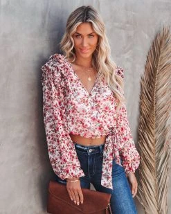 //VICI Exclusive// Best Selling Silhouette// Brunch with your squad in our Cut Above Floral Chiffon Wrap Blouse! This true wrap top features florals in fuchsia, wine, olive, and dusty blue on an ivory base. Finished with a ruffle trim and a draped neckline. Styled with the Perfect Hoop Earrings, Chloe Mini Necklace, Spiral Pendant Necklace, Simple Bangle Bracelet, Stella Crossbody Envelope Zip Clutch, Steady High Rise Distressed Skinny, and Mai Square Toe Heeled Sandal.